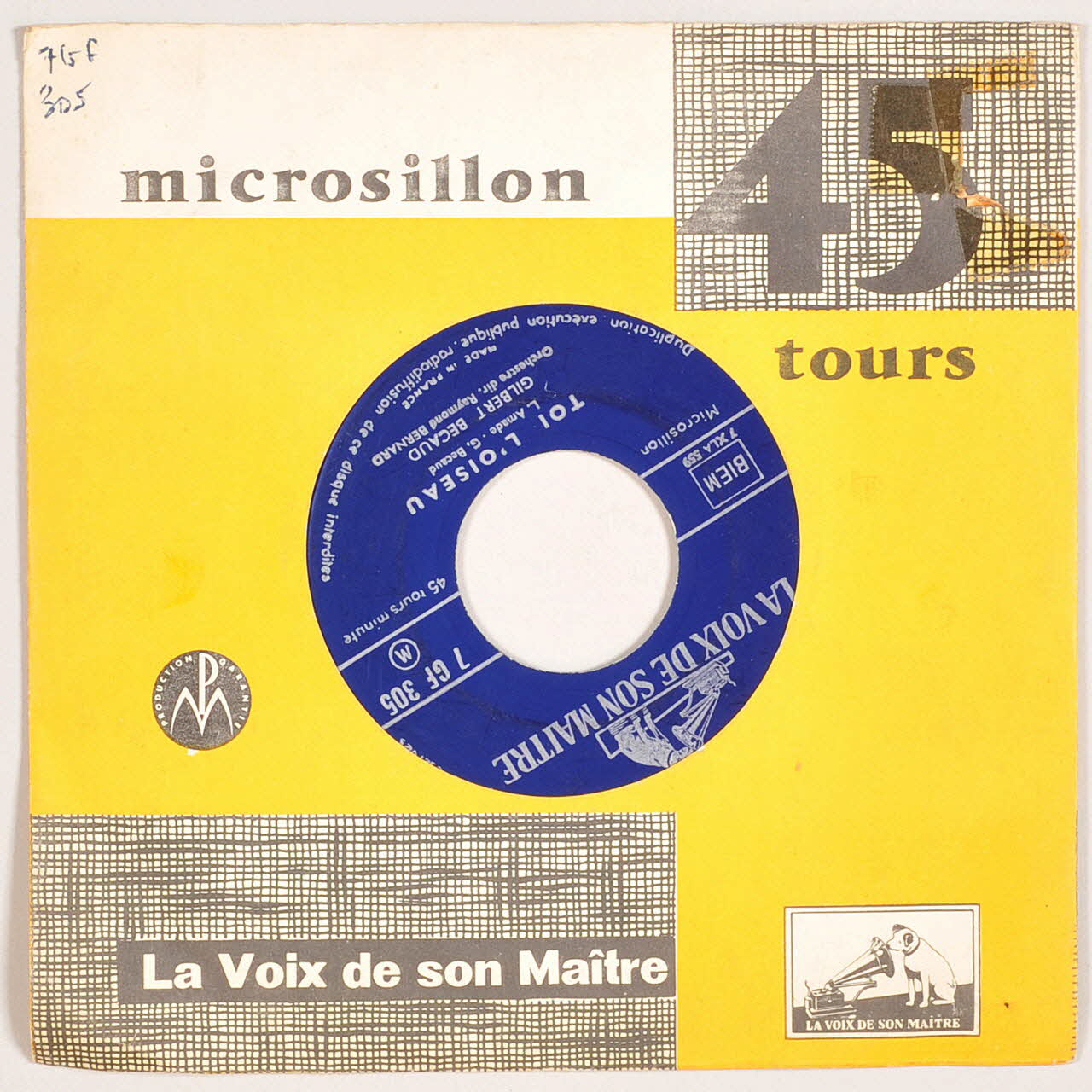 BIEM 7 XLA 559 (au centre du vinyle)DISQUE RADIO / MUSIQUE PIANO // JEAN REMOND // 124, AVENUE DE NEUILLY // MAI-09-00 (sur le disque, sur une étiquette rajoutée)Matériaux et techniques