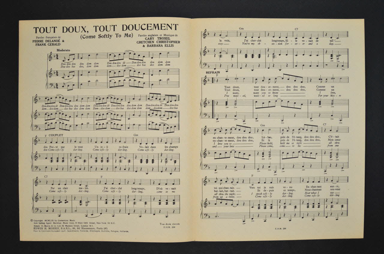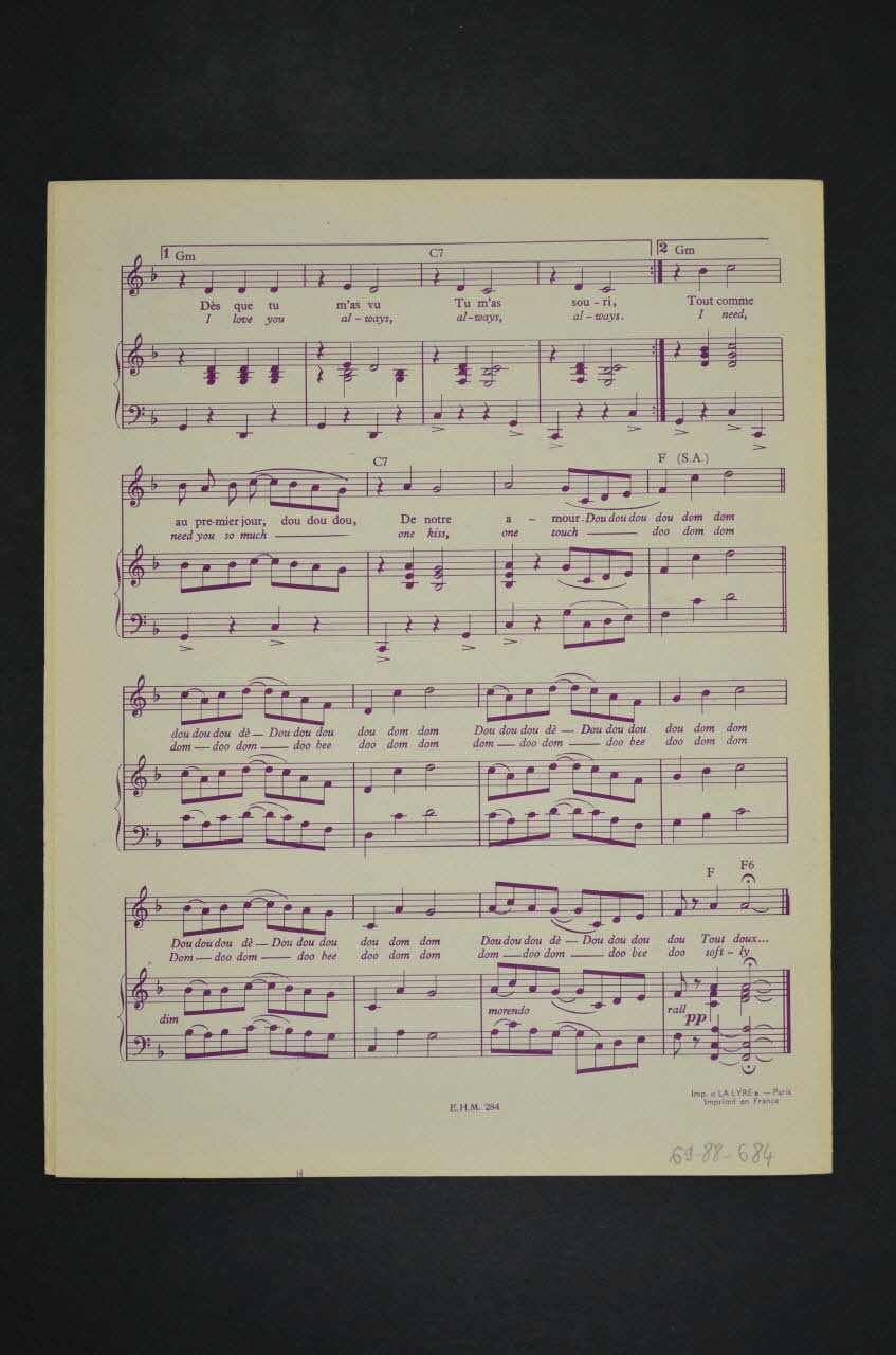 Les inscriptions renseignent le titre de la chanson, le nom des auteurs, de l'artiste et de l'éditeur. A l'intérieur et au dos, la partition et les paroles de la chanson.Matériaux et techniques