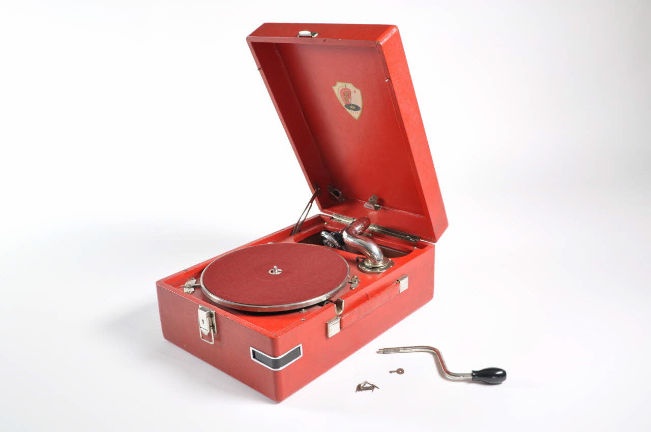 Lieu : URSS(ex)Dans un coffret en bois rouge recouvert d?un plaquage imitant le cuir, cet objet lit les disques de 78 tours par minute. Une molette permet d?ailleurs de régler la vitesse de lecture, en indiquant d?un côté « medlen », de l?autre, « bystro » (lent / rapide). La platine est recouverte d?un morceau de velours rouge, ce qui rappelle les couleurs de l?objet. Le bras est en métal argenté.