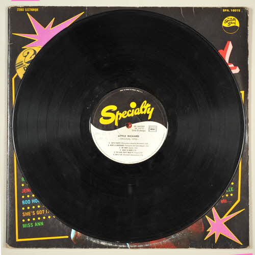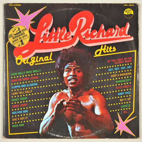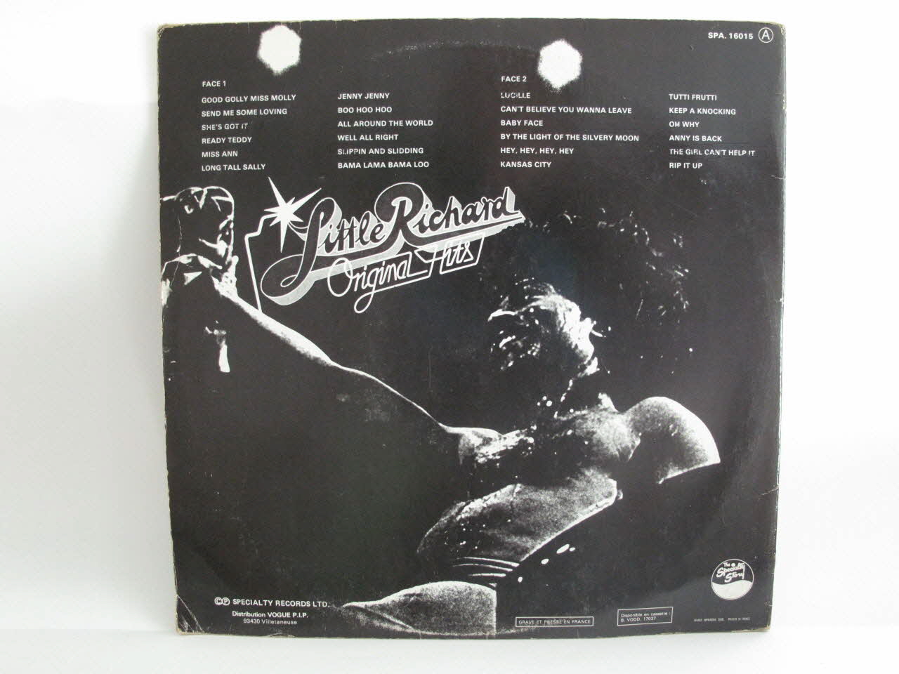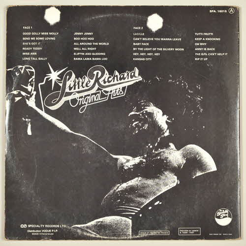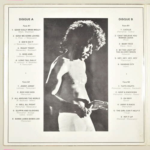 SPA. 16015 (référence de l'album)disque A : // face 1 : // 1. Jenny jenny // 2. Boo hoo hoo // 3. All around the world // 4. Well all right // 5. Slippin and slidding // 6. Bama lama bama loo // // face 2 : // 1. Good golly miss Molly // 2. Send me some loving // 3. She's got it // 4. Ready Teddy // 5. Miss Ann // 6. Long tell Sally // // disque B : // face 1 : // 1. Lucille // 2. Can't believe you wanna leave // 3. Baby face // 4. By the light of the silvery moon // 5. Hey, hey, hey // 6. Kansas city // // face 2 : // 1. Tutti frutti // 2. Keep a knocking // 3. On why // 4. Anny is back // 5. The girl can't help it // 6. Rip it up (titre des chansons // 24 titres)Décor