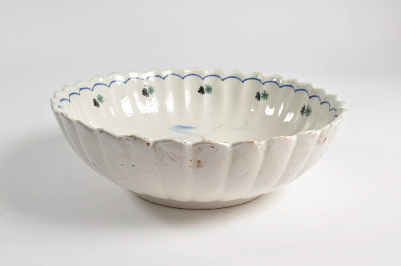 Faïence moulée, à décor peint au pinceau, à glaçure opaque blanche / Sur plan circulaire, à bords moyens, galbés, chantournés, godronnés, décoré d'un filet festonné bleu, de fleurs vertes et noires. Sur fond de décor polychrome, dans un paysage de campagne et de village, un gendarme à cheval avec une épée conduit un prisonnier, menottes aux mains. Pied couronne percé à deux reprises.