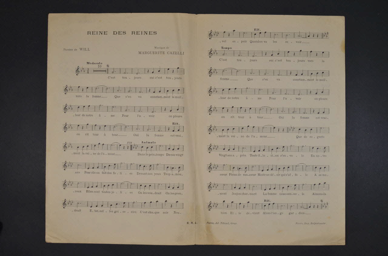 Des inscriptions renseignent le titre, les auteurs, les exécutants et l'éditeur. A l'intérieur, partition et paroles de la chanson. Au dos, liste d'autres partitions publiées par l'éditeur.Matériaux et techniques