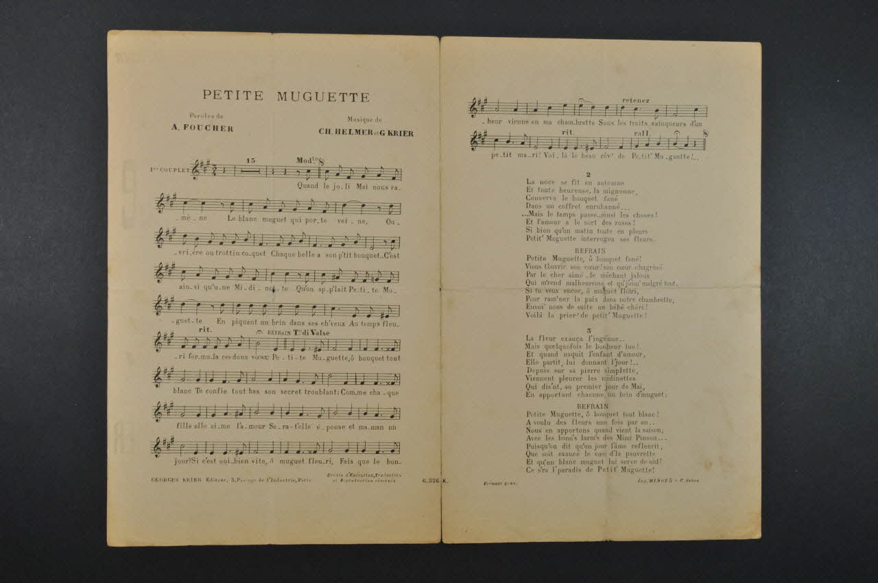 Des inscriptions renseignent le titre, les auteurs, les exécutants et l'éditeur. A l'intérieur, partition et paroles de la chanson. Au dos, liste d'autres partitions publiées par l'éditeur.Matériaux et techniques