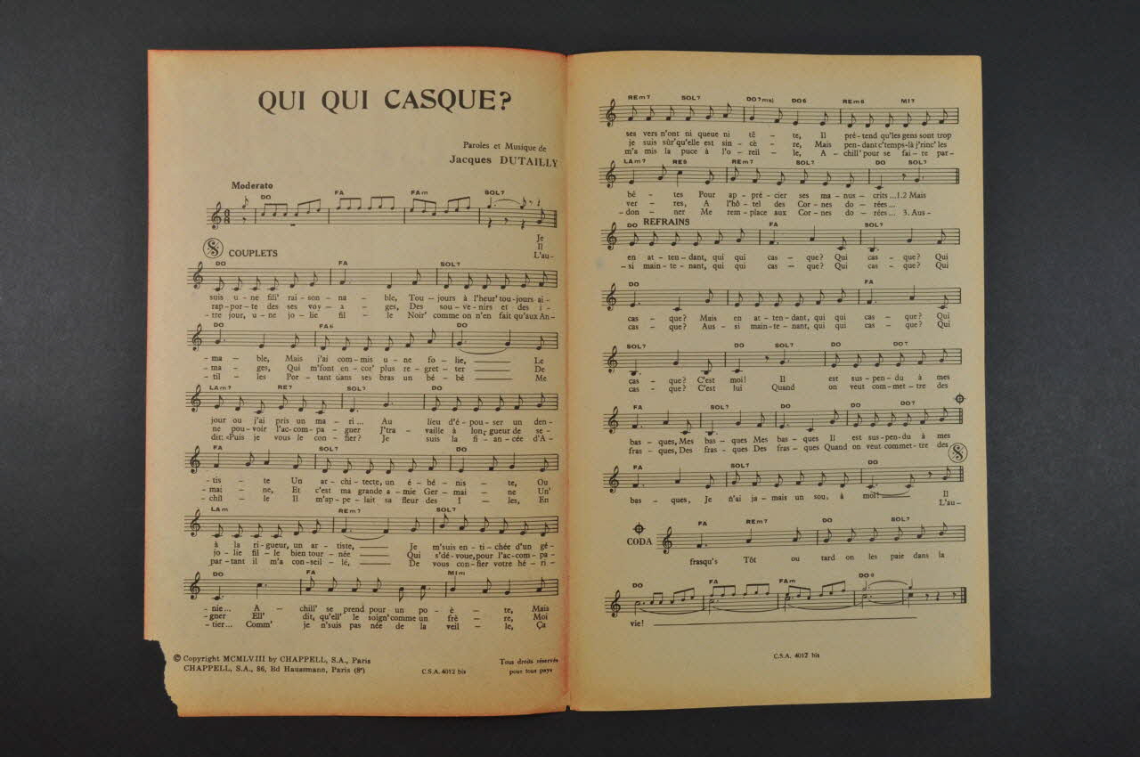 Les inscriptions renseignent le titre de la chanson, le nom des auteurs, de l'artiste et de l'éditeur. A l'intérieur, la partition et les paroles de la chanson. Au dos, une liste de titres diponibles chez le même éditeur.Matériaux et techniques