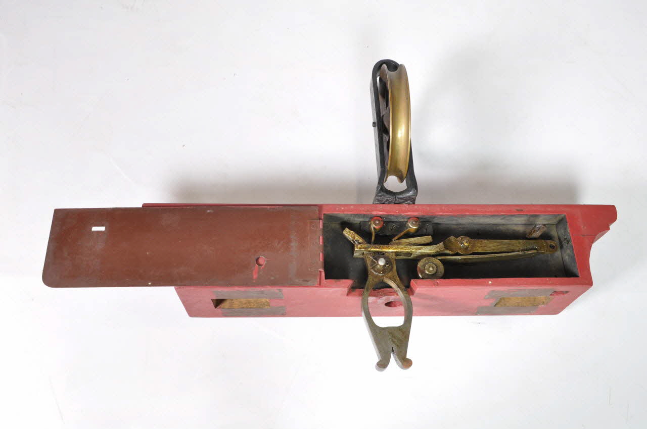 Sur sa partie supérieure, une poulie en laiton à rayon en rosace, bloquée par une pièce de fer vissée à la rainure. Perpendiculairement, la pièce de bois est percée de trois trous dont un correspondant au passage de la corde, coulissant sur la poulie, sortant en partie inférieure et soutenant le mouton (1982.50.2.11) par son crochet. Les deux autres trous correspondent au passage des systèmes d'attache des montants à la rainure. En partie inférieure, deux pièces de fer articulées formant une pince, retiennent le mouton (1982.50.2.11) par sa flèche en fer. Sur sa face, une petite trape s'ouvre sur le mécanisme permettant d'huiler les parties en fer. La trape se ferme par un loquet qui s'imbrique dans un anneau.Matériaux et techniques