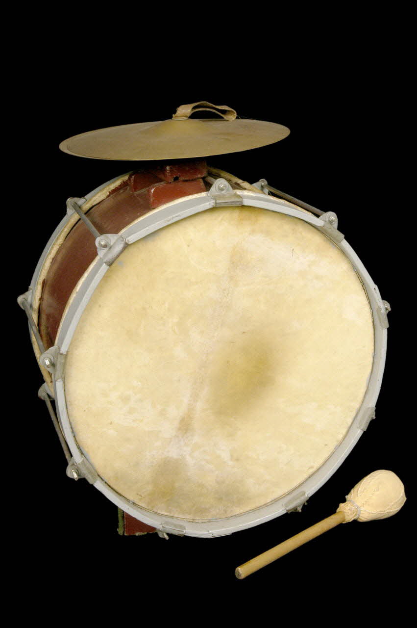 Berceau - socle en bois peint inamovible ( deux parties ) pour jeu au sol. Socle de cymbale en bois peint, fixé au fût. Deux rondelles de fixation de la cymbale, une en cuivre rouge, l'autre en tôle. L'axe est en métal. Cymbales en cuivre ( ? ). La poignée en cuir de la cymbale est fixée avec un écrou et deux rondelles. Peau de boeuf. La mailloche a un manche en bois blanc et une boule faite avec du tissu comprimé, elle est fixé sur le manche avec de la colle et un fil de fer. / L'instrument se joue posé à terre ou tenu avec une courroie pour le jeu en déplacement. Une main tient la mailloche qui frappe la peau du tambour, l'autre main tient la cymbale libre qui frappe la cymbale fixe.Actuellement le fût est peint en gris et les cercles sont en brun - rouge.Décor