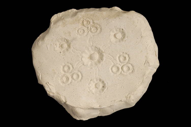 Ce moulage représente une rosace composée de plusieurs éléments : autour d'une marguerite, au centre du moulage, se déploient alternativement trois triskèles et trois marguerites. Il s'agit du décor sculpté au-dessus du faux-dormant de la partie inférieure d'un buffet haut.Inscriptions