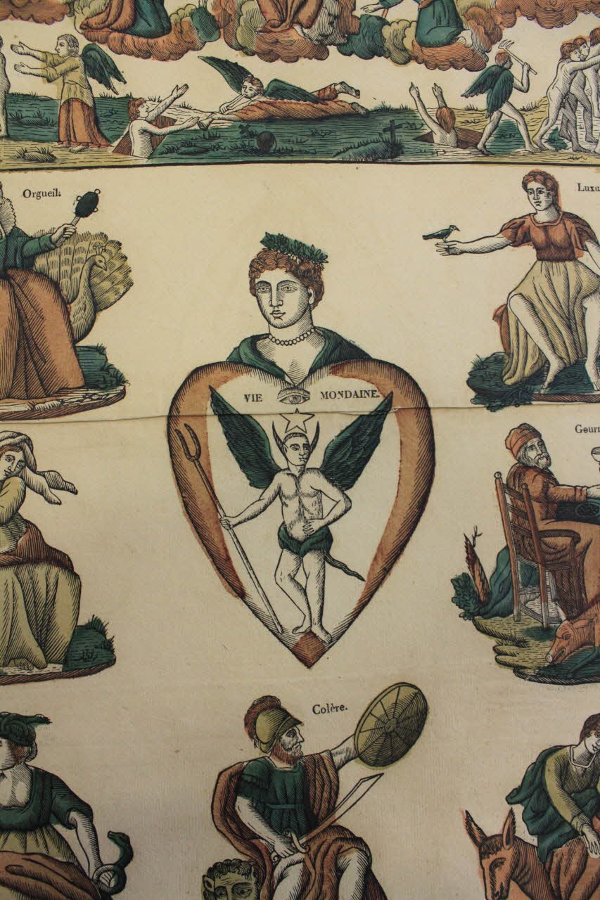 L'image est divisée en deux registres. Le registre supérieur présente une représentation du Jugement dernier. Au registre inférieur, les allégories des Sept Péchés capitaux s'organisent autour d'un buste féminin, incarnant "la vie mondaine", qui surmonte la figure de Satan, ailé, cornu et tenant la fourche.Inscriptions