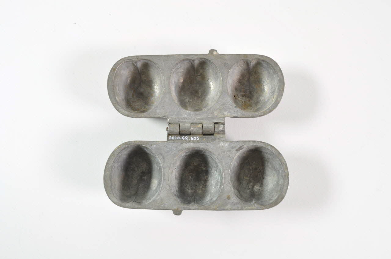 Il s'agit d'un moule bivalve de confiseur. Il est réalisé en étain et comporte un assemblage par charnières.