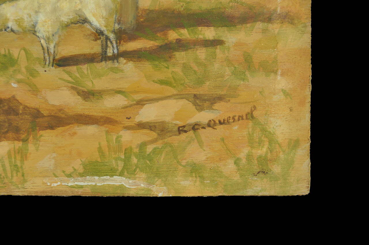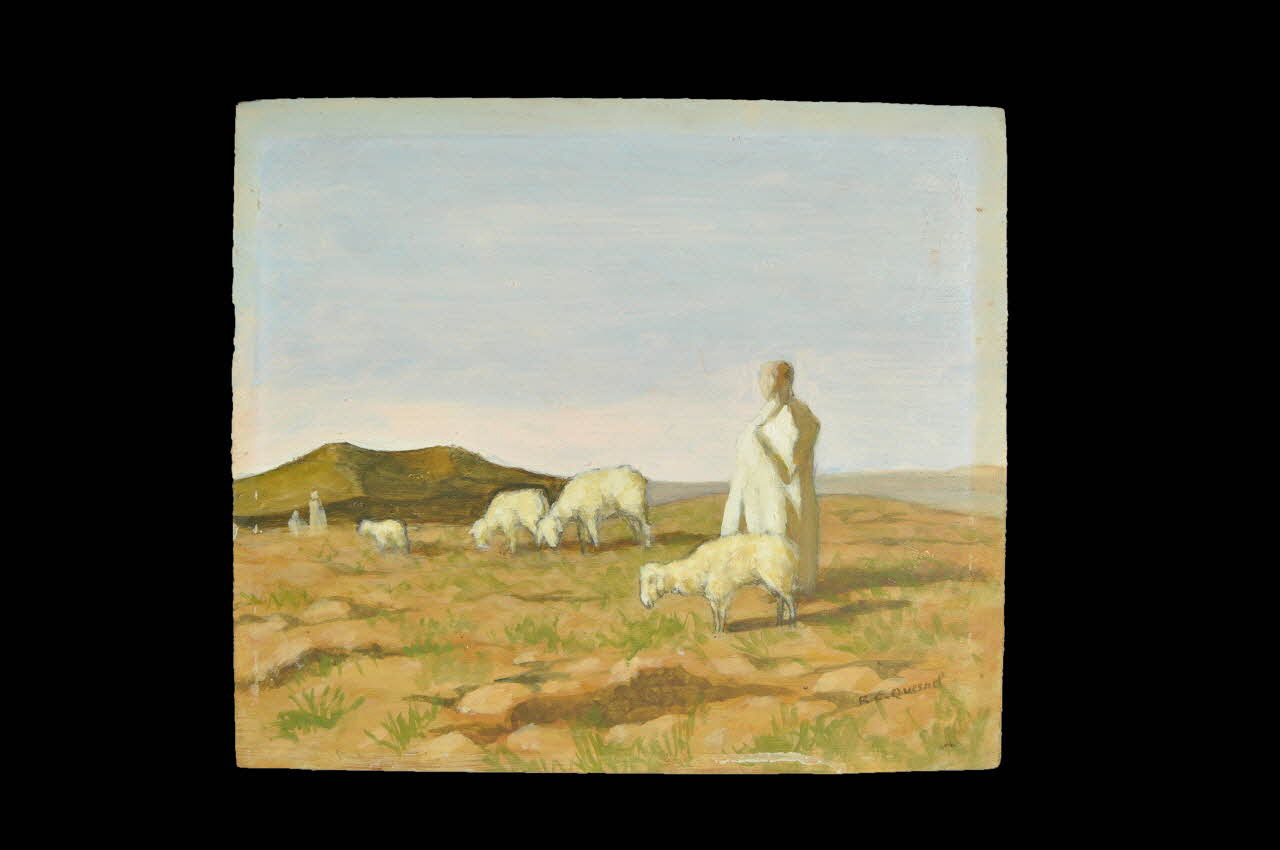 La scène représente au premier plan un berger accompagnant ses moutons. A l'arrière plan figure un paysage semi-désertique d'Afrique du Nord. Deux autres silouhettes apparaissent dans le lointain et la facture est lisse.Décor