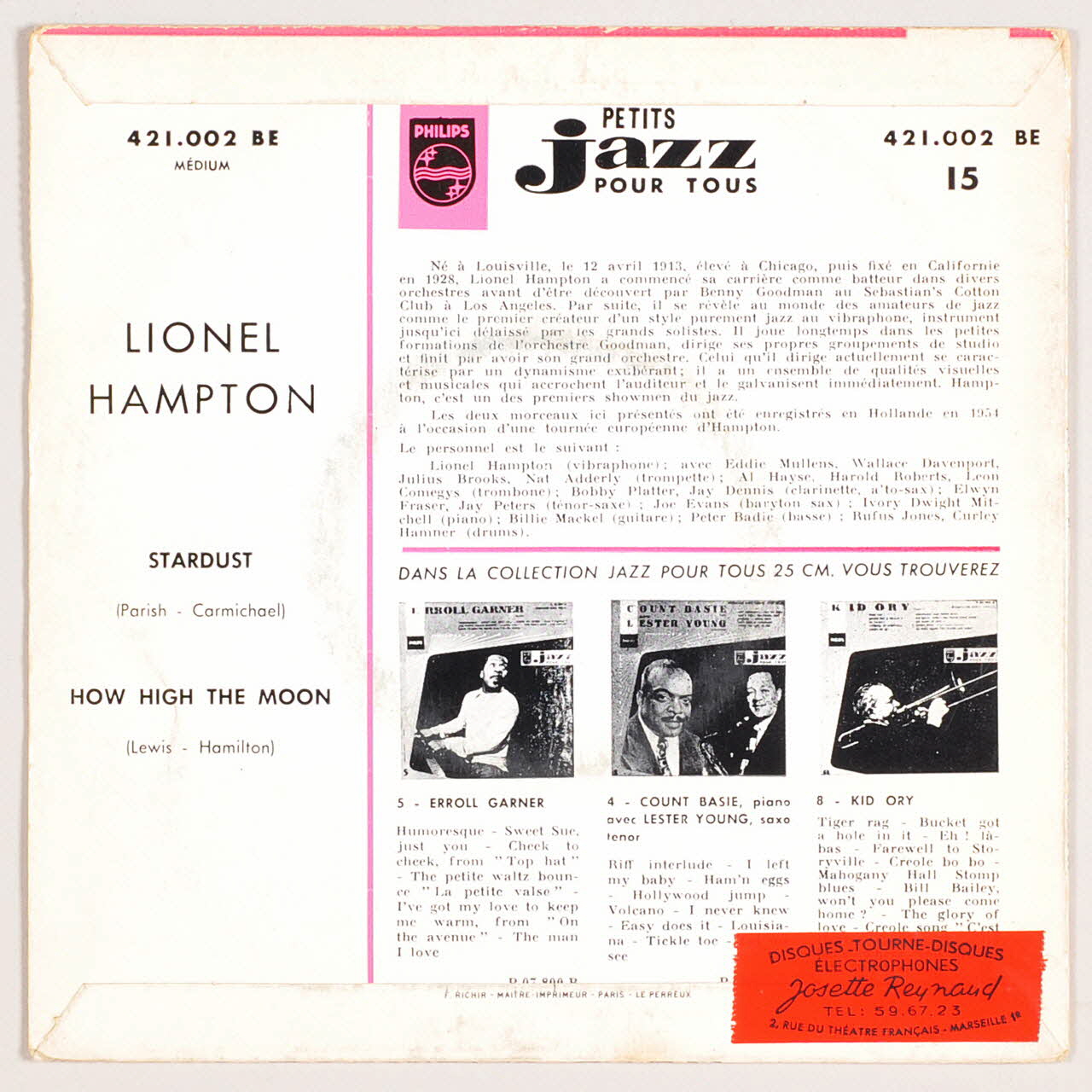 Au verso, on trouve une présentation de la vie de l'artiste, ainsi qu'une présentation de la collection "Jazz pour tous". Une étiquette rouge a été ajoutée dans l'angle inférieur droit au dos de la pochette. Au centre du vinyle, sur les deux faces, une étiquette ronde en papier imprimé de couleur blanche avec une écriture noire et bleue.Matériaux et techniques