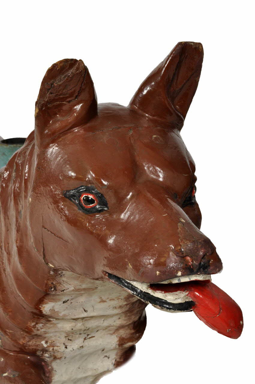 Loup sauteur en bois sculpté, assemblé et peint de marron sortant la langue vers le côté gauche. Il appartenait à un manège.