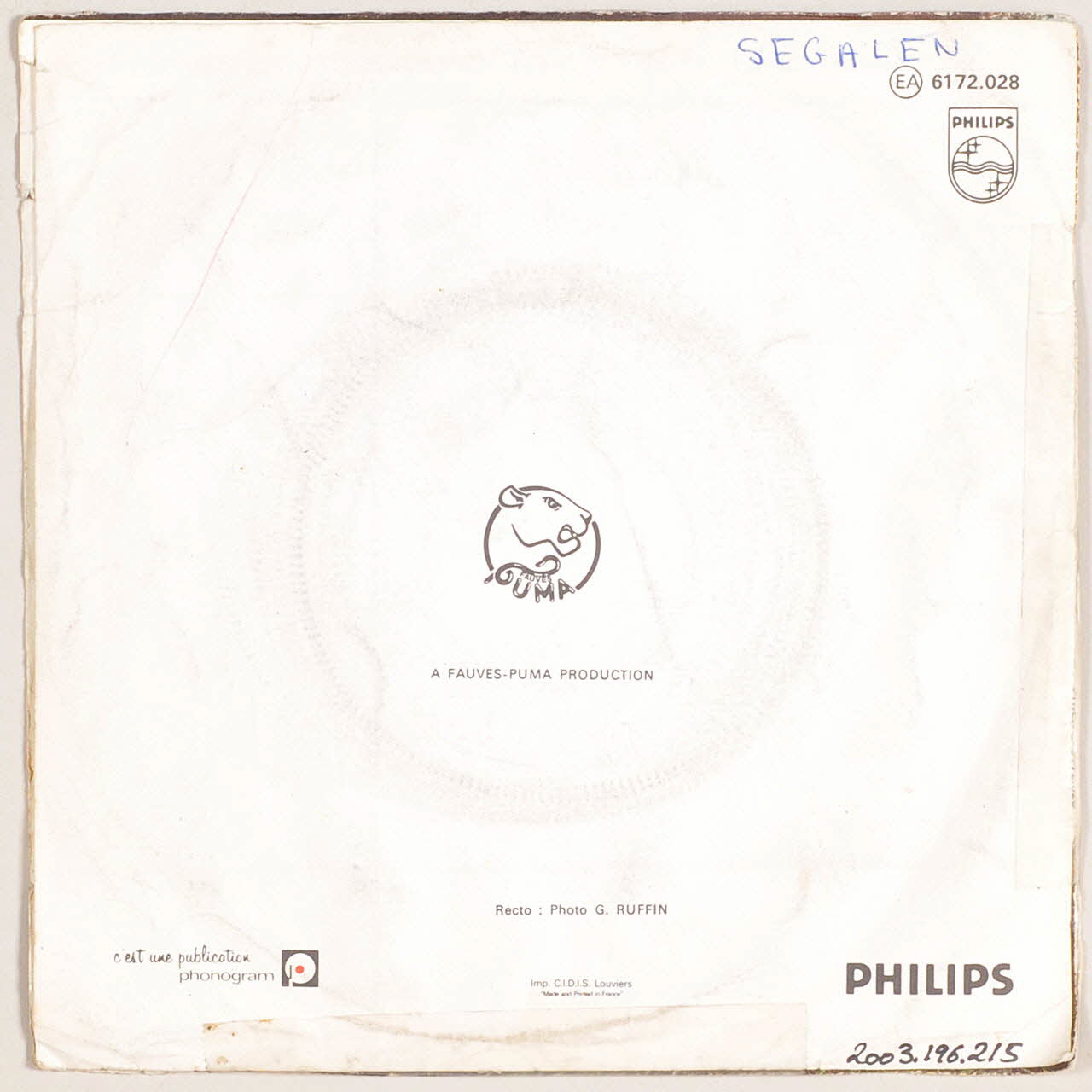 Le disque vinyle présente, sur les deux faces, une étiquette circulaire en papier bleu avec des inscriptions noires.Matériaux et techniques