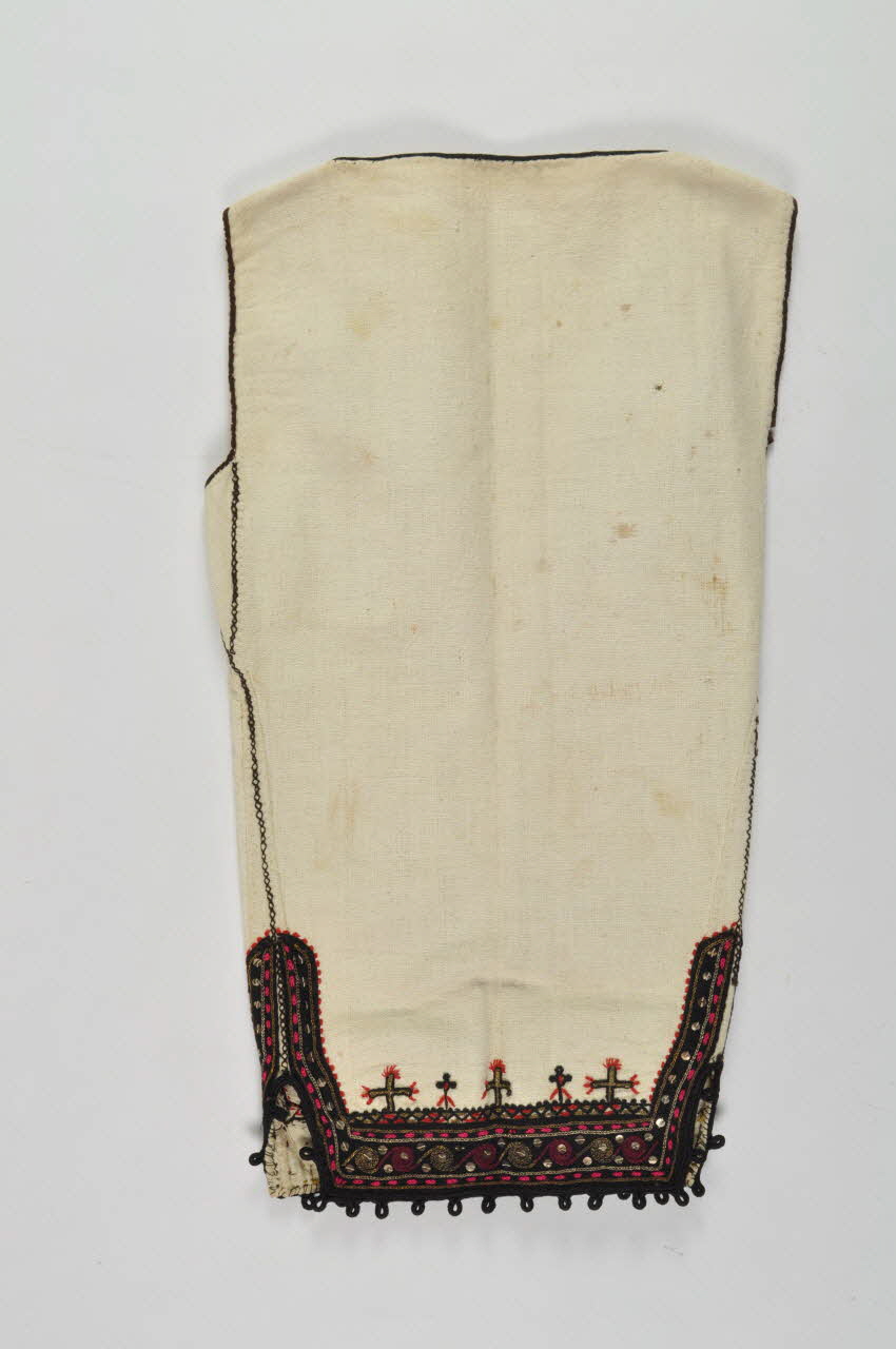 Paletot rectangulaire beige avec soutache en coton noir sur le bord intérieur et soutache en laine marron sur le bord des manches ; décor géométrique multicolore (rouge, violet, noir, fils métalliques) ; décor de soutaches, paillettes et crochet.Matériaux et techniques