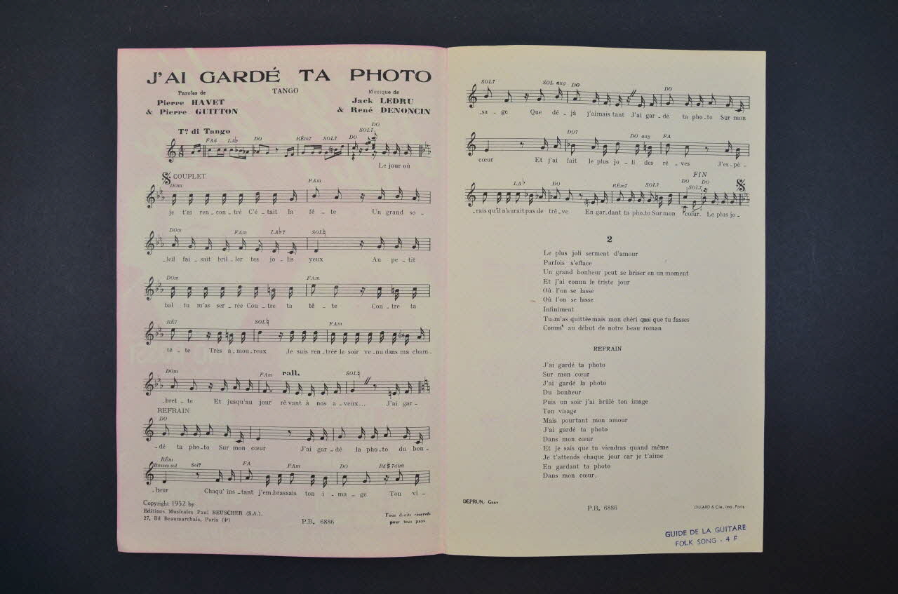 chanson, petit format, partition de musique, J'ai gardé ta photo