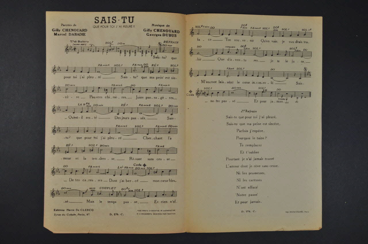 Des inscriptions renseignent le titre, les auteurs, les exécutants et l'éditeur. A l'intérieur, partition et paroles de la chanson. Au dos, liste d'autres partitions publiées par l'éditeur.Matériaux et techniques