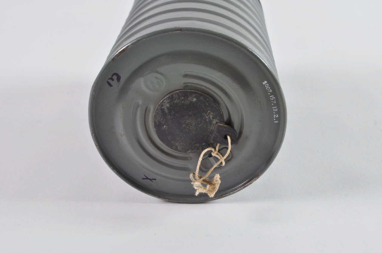 Bouteille ou bombonne cylindrique et moulurée en métal vernis de couleur grise er munie d'un bouchon de couleur noire.