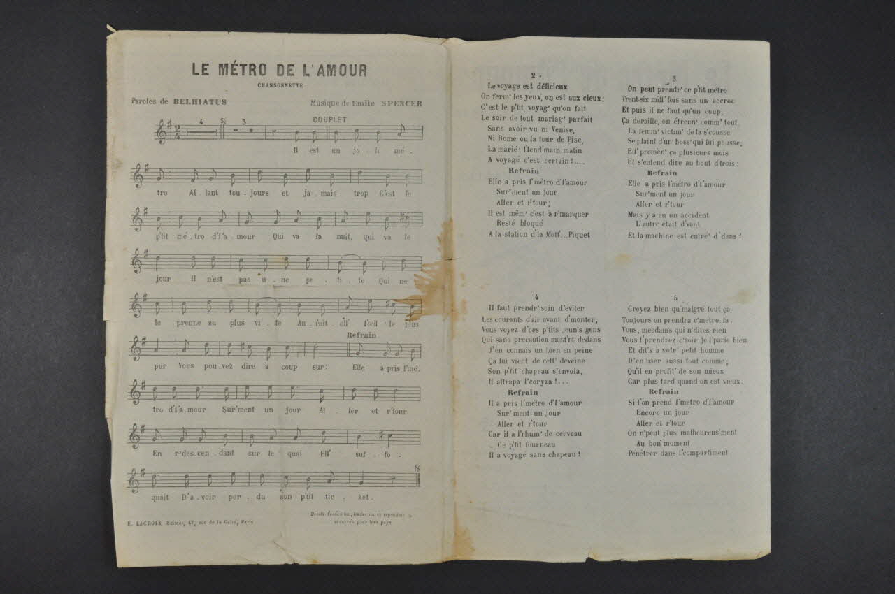 Des inscriptions renseignent le titre, les auteurs, les exécutants et l'éditeur. A l'intérieur, partition et paroles de la chanson. Au dos, liste d'autres partitions publiées par l'éditeur.Matériaux et techniques