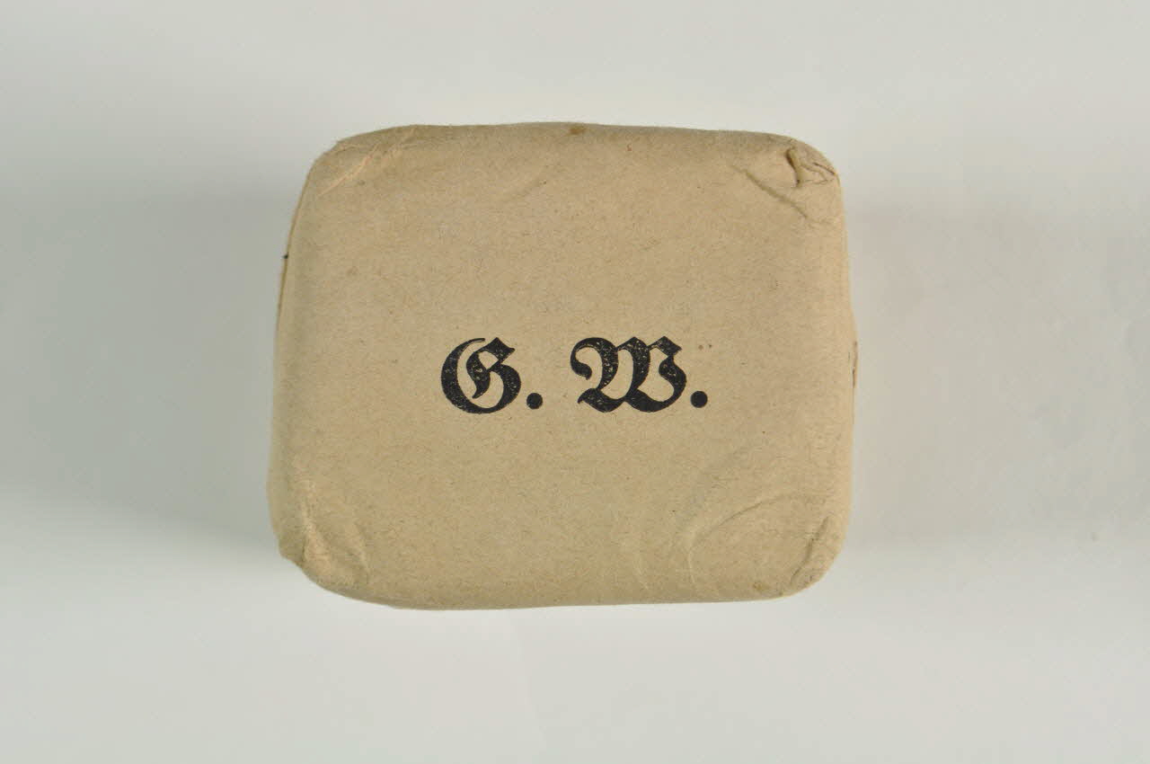 Nur hier öffnen! (En lettres gothiques, souligné), sur une faceInitiales