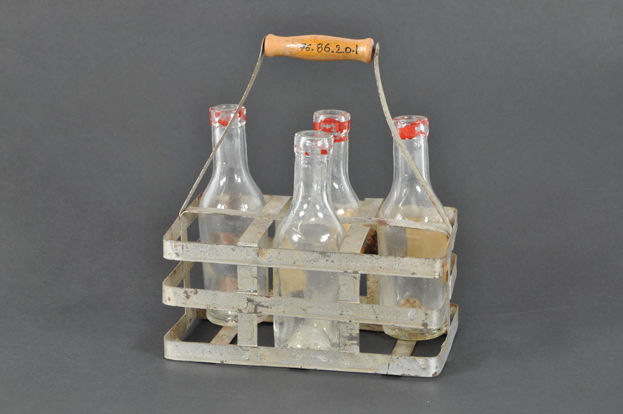 A corps cylindrique, à col cylindrique muni d'un goulot plat à son exrémité supérieure, à fond rentré semi-sphérique. Des traces de peinture rouge sont visibles sur l'extérieur du goulot, et un reste d'étiquette rectangulaire en papier beige est collé sur le corps.Matériaux et techniques