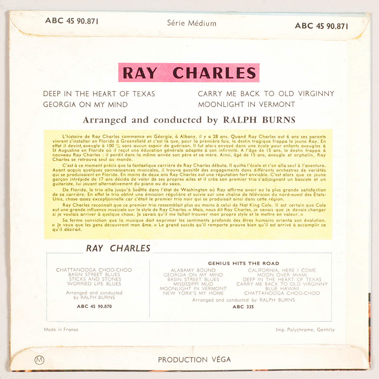 Au verso, on trouve des informations sur les chansons et l'histoire de Ray Charles. Au centre du vinyle, sur les deux faces, une étiquette ronde en papier imprimé de couleur noire avec une écriture blanche. L'éditeur est inscrit de couleur jaune, rouge et bleue en alternance.Matériaux et techniques