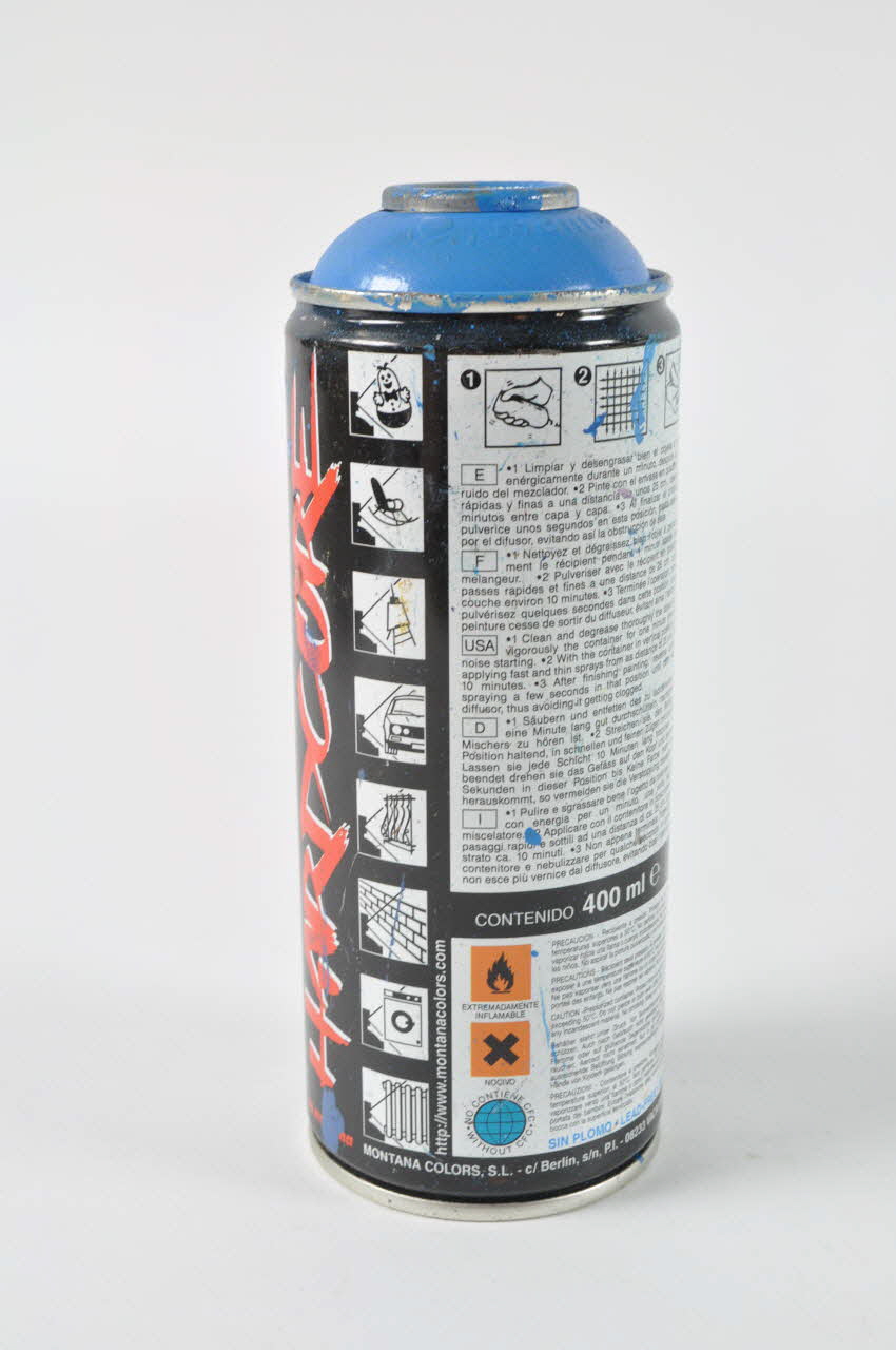 La bombe à pulvériser ne comporte pas d'embout de spray ni de bouchon. De forme cylindrique, l'objet comporte une capsule en métal entièrement peinte en bleu et amovible. Le graphisme de cette bombe s'organise de la manière suivante: deux incriptions disposées en longueur encadrent un logo central de forme géométrique de couleurs rose, bleu et vert, sur un fong noir quadrillé en blanc. Près de l'incription en rouge apparaissent des pictogrammes qui détaillent les supports d'utilisation (voitures, murs, objets ménagers ....). Au dessus du logo, on note le type de peinture en anglais et espagnol. Une seconde partie avec des inscriptions concernants les conditions d'utilisation et de précaution également agrémentées de trois autres pictogrammes.Inscriptions