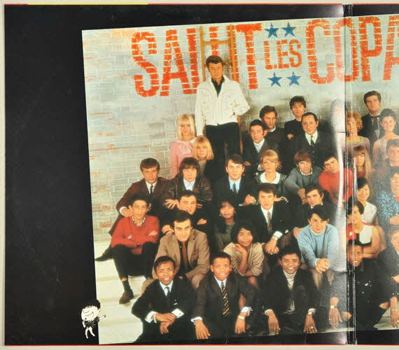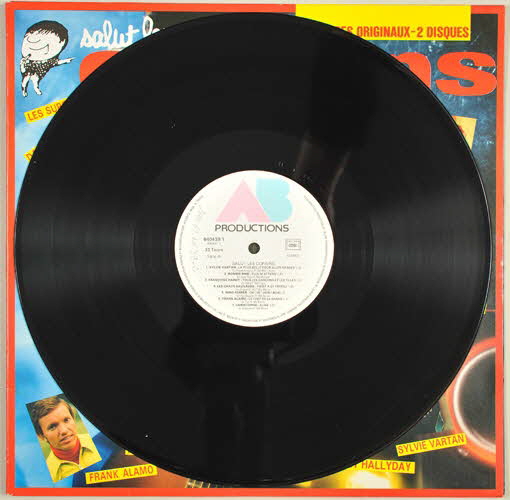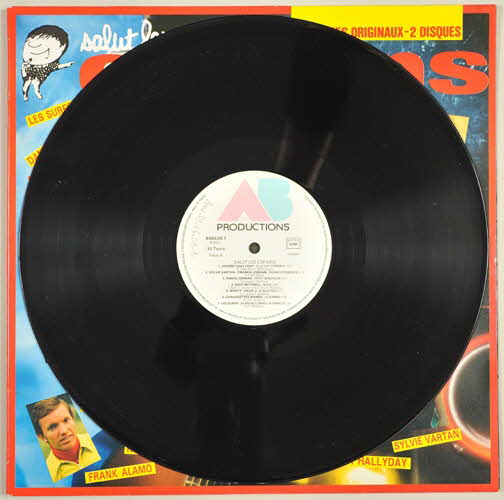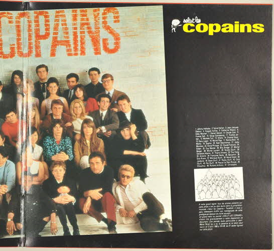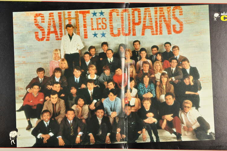 disque en vinyle de couleur noire / pochette en carton / enveloppe de protection en papier blanc / pochette double - au recto de la pochette, huit photographies : une photographie regroupant 47 "idoles" du début des années 1960 en France prise le 12 avril 1966, une photographie d'Hervé Vilard, de Claude François, de Frank Alamo, de Sheila, du groupe "Les chaussettes noires", de Dick Rivers et de Johnny Hallyday entouré de Sylvie Vartan et de Françoise Hardy - noms de 24 artistes inscrits en lettres capitales rouges sur fond jaune - photographie d'un manche de guitare - à l'intérieur de la pochette, photographie en gros plan des 47 "idoles" réunis par Jean-Marie Perier et posant devant un mur sur lequel est inscrit en lettres capitales rouges "SALUT LES COPAINS" - à droite, schéma et numéros indiquent le nom de chacun des artistes - il s'agit de : Johnny Hallyday, Sylvie Vartan, Jean-Jacques Debout, Hugues Aufray, Catherine Ribeiro, Eddy Mitchell, Daniel Gerard, Claude Ciari, France Gall, Serge Gainsbourg, Frankie Jordan, Michel Torr, Sheila, Chantal Goya, Dany Logan, Michel Paje, Ronnie Bird, Monty, Sophie, Noël Deschamps, Jacky Moulière, Annie Philippe, Claude François, Eileen, Guy Mardel, Billy Bridge, Michel Berger, Michel Laurent, Nicole (Surf), Salvadore Adamo, Thierry Vincent, Tiny Yong, Antoine, Françoise Hardy, Benjamin, Dick Rivers, Monique (Surf), Hervé Vilard, Jocelyne, Dave (Surf), Pat (Surf), Pascal (Petit Prince), Chouchou, Richard Anthony, Christophe - au dos de la pochette, titre des chansons, liste des participants, photographie des 47 "idoles" et photographie d'un manche de guitareInscriptions