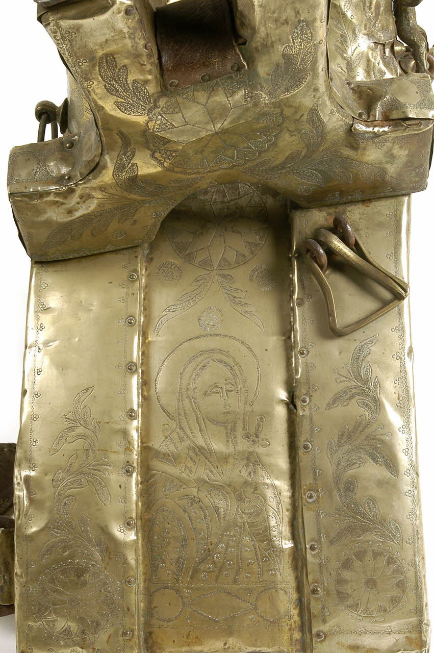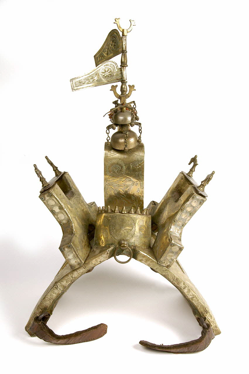 Bois, métal, cuir, laine / en bois recouvert de plaques de métal gravé: décor végétal et anthropomorphe, muni de clochettesMatériaux et techniques