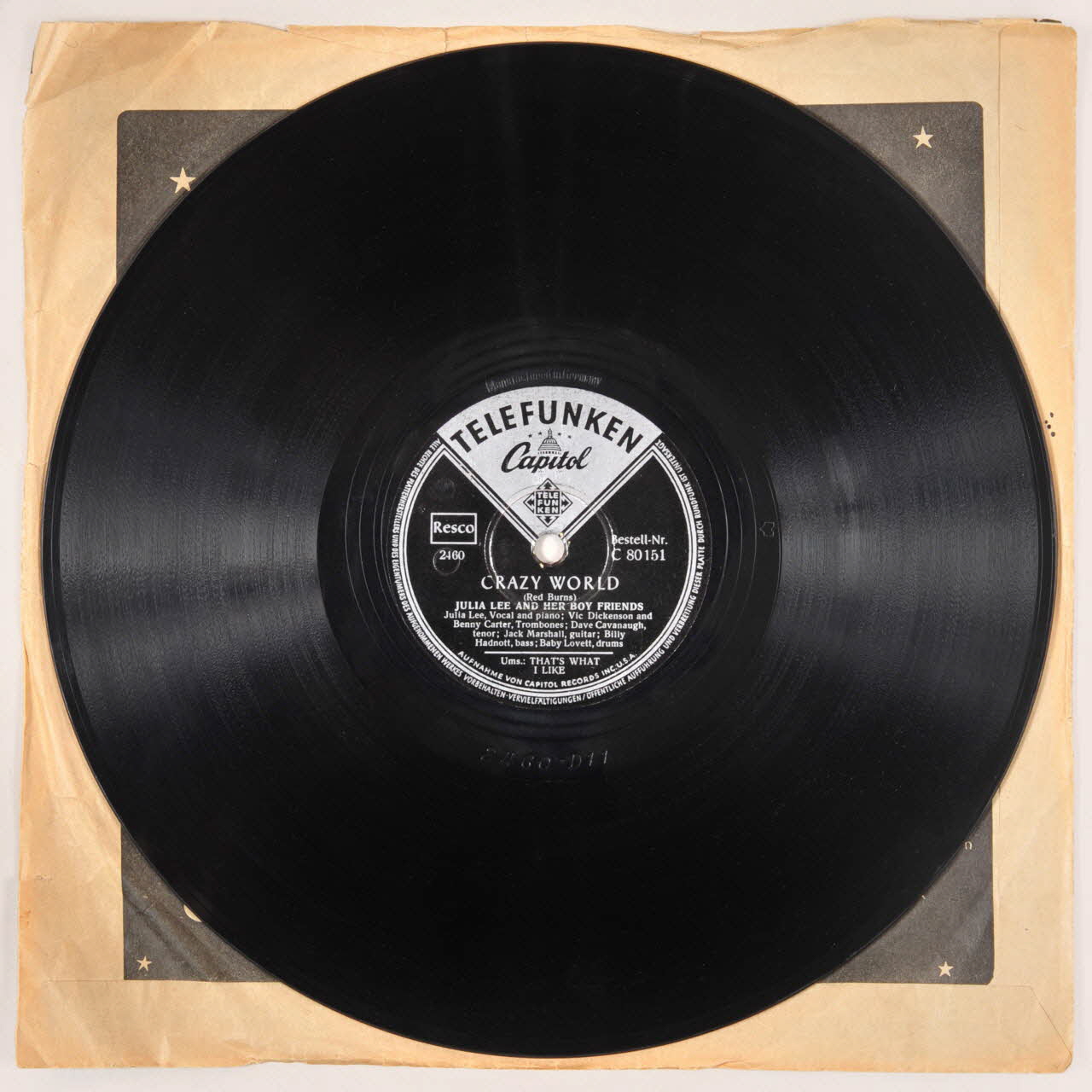 Le disque est placé dans une pochette de papier marron, ajourée au centre pour permettre de lire les informations du disque, avec le nom de l'éditeur. Sur une face, mention de la maison de disque, sur l'autre face, photographie en noir et blanc de deux musiciens de jazz américains, Jo Stafford et Stan Kenton sur un fond d'étoiles et de notes de musique avec un texte en allemand en bas à gauche.Décor