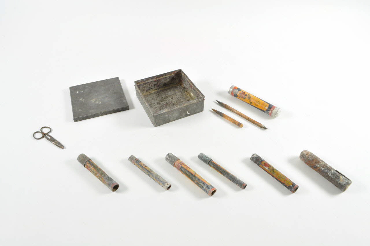 .5-9 : Cinq tubes cylindriques en carton imprimé, de tailles différentes. Inscriptions noires et rouges sur fond noir et jaune. .10 : Tube cylindrique en aluminium peint. Inscriptions noires et rouges sur fond noir et jaune. .11 : Fard beige cylindrique, emballé dans un papier jaune. .12 : Paire de ciseaux en fer. .13 : Bâtonnet en plastique jaune, à une extrémité effilée. .14 : Bâtonnet en bois, aux extrémités effilées.Matériaux et techniques