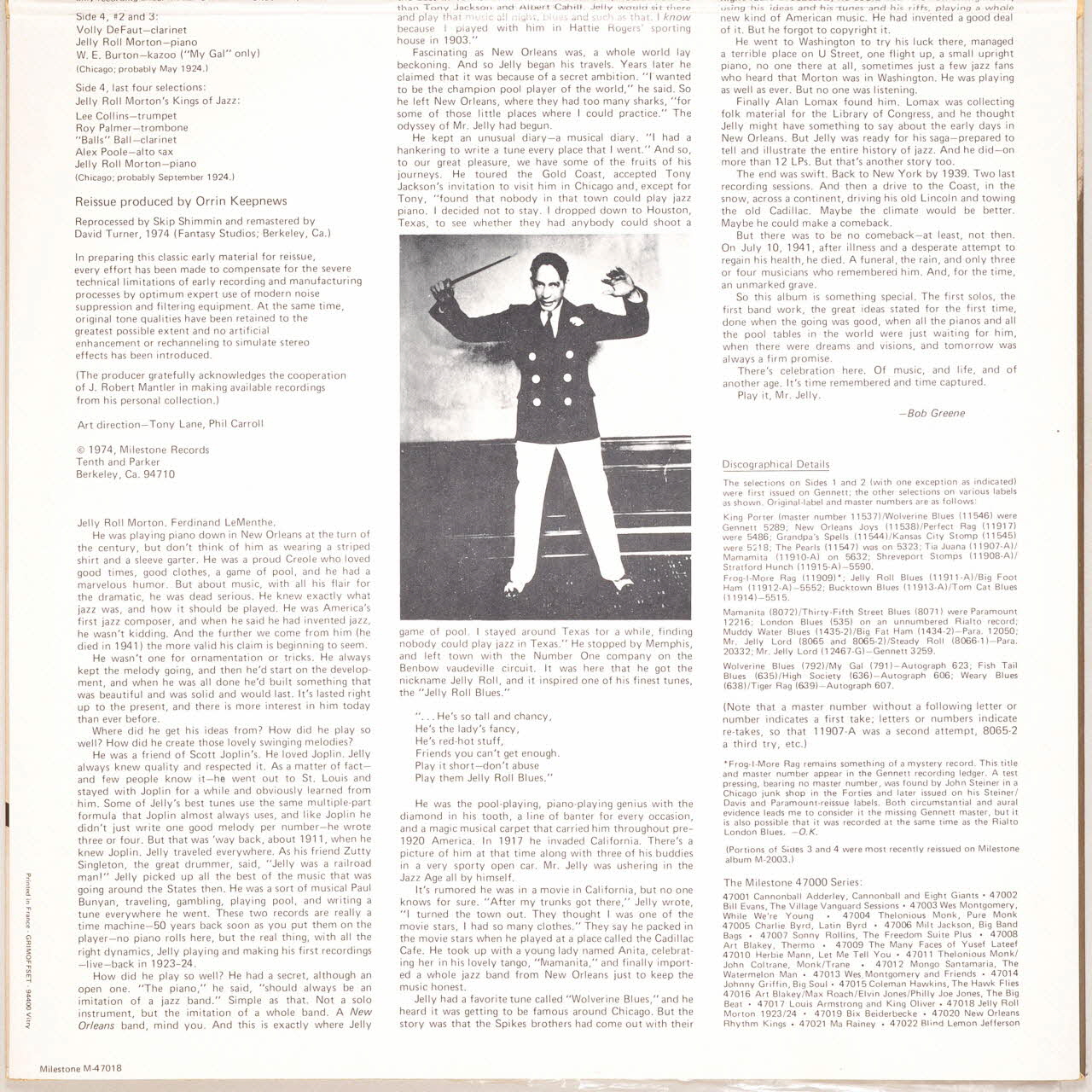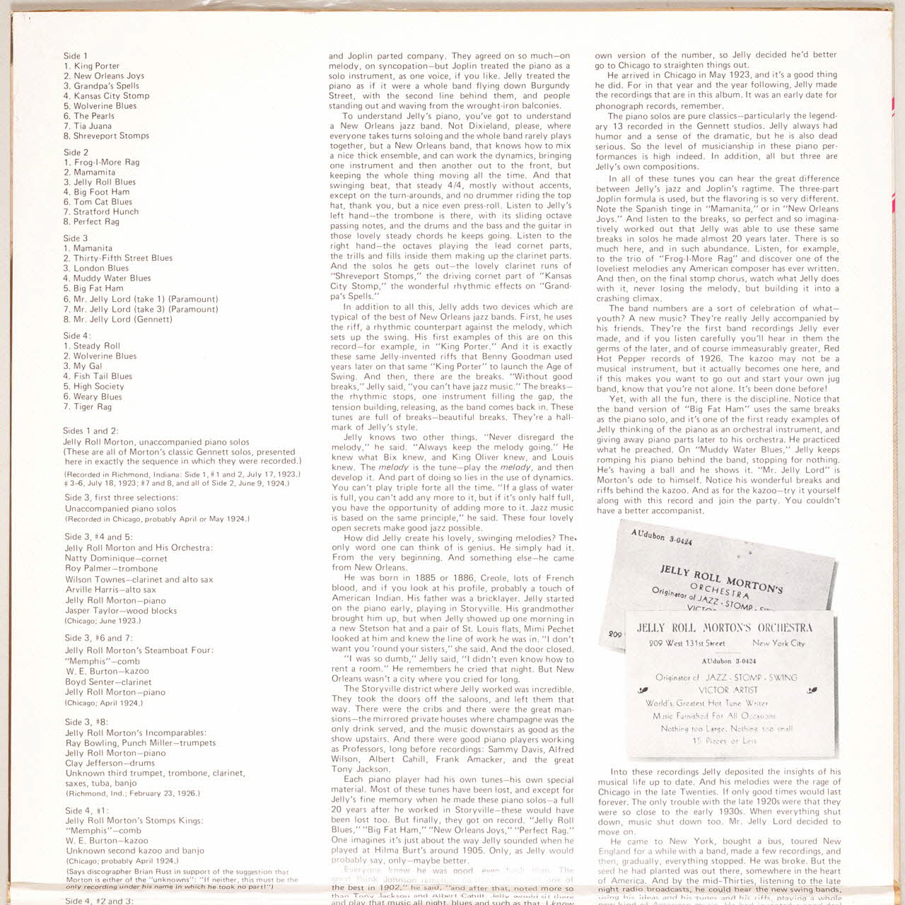 disque 33 tours, Frog-i-more-rag, Big fat ham, Wolverine blues, High society, Jelly-Roll Morton, Perfect rag, Mr Jelly Lord, Thirty fifth St.Blues, Jelly roll blues, Stratford hunch, Steady Roll, Kansas City stomp, Weary Blues, Fish tail blues, Tiger Rag, King Porter, Tia Juana, Mamamita, Muddy Waters, Big foot ham, Bucktown blues, The pearls, New Orleans Joys, My gal, Shreveport stomps, London blues, Grandpa's spells