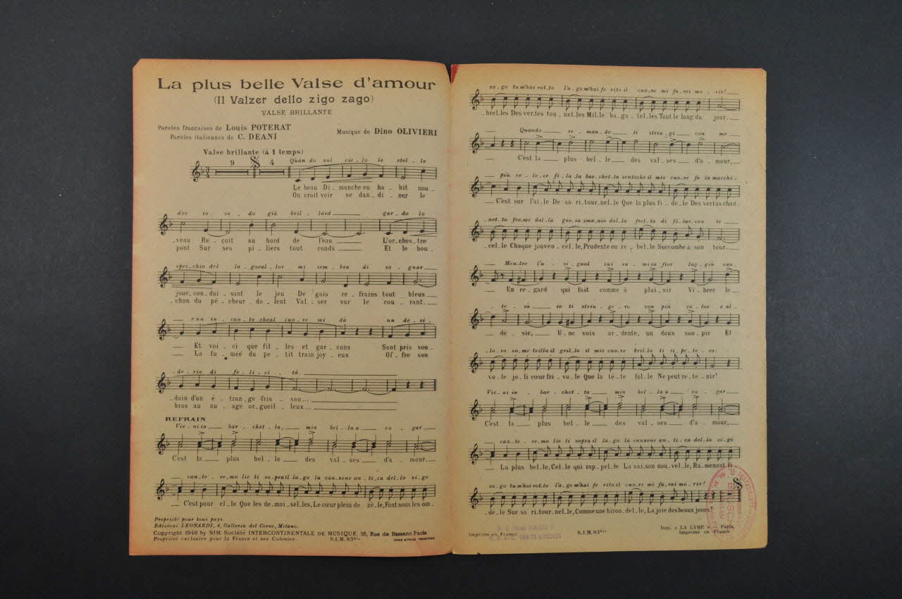 Des inscriptions renseignent le titre, les auteurs, les exécutants et l'éditeur. A l'intérieur, partition et paroles de la chanson. Au dos, liste d'autres partitions publiées par l'éditeur.Matériaux et techniques