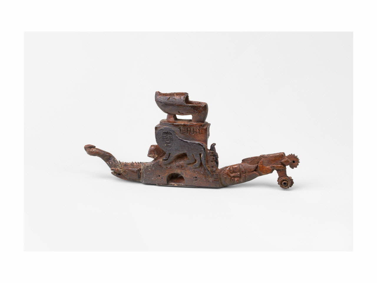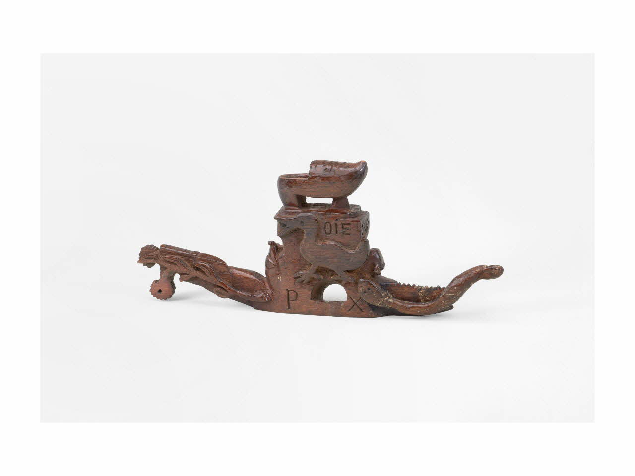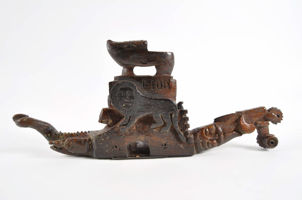 Bois sculpté, gravé et verni, acier. / Outil en bois gravé et sculpté, muni d'un fer transversal. Le bois est orné d'un sabot, d'un lion, d'une oie, d'une tête masculine, d'une serpe, d'une roue dentée, d'un serpent, d'un domino, d'une bouteille et d'une branche.Matériaux et techniques