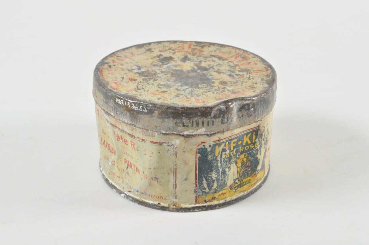 Boîte cylindrique en fer peint en jaune, avec des inscriptions rouges et jaunes dans des cadres rouges. Un cadre représente un homme barbu près d'un âne qui porte des caisses. Elle contient de la poudre blanche et une éponge en matière textile pour l'appliquer.Matériaux et techniques