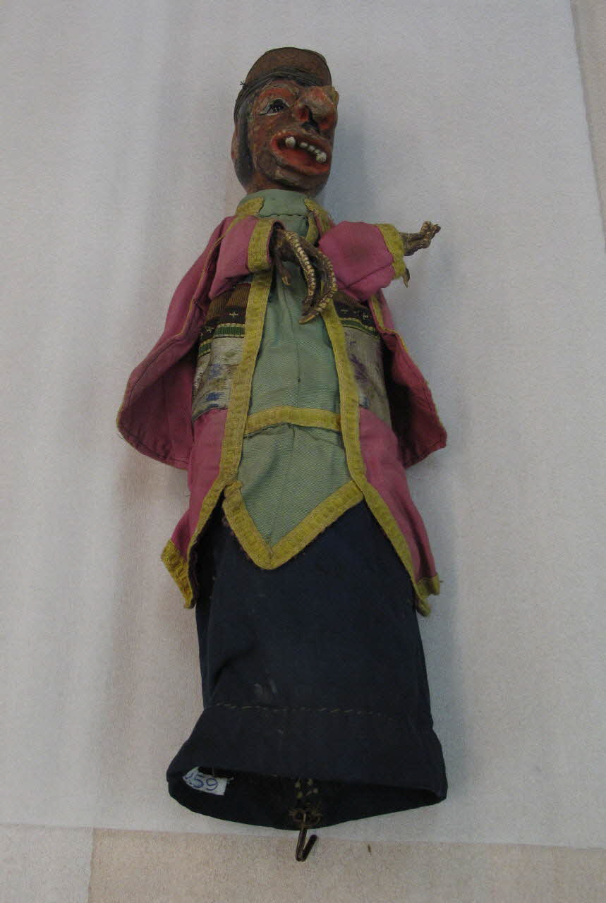 tête en bois sculpté et peint à l'huile, tissu mauve vert et jaune avec galon jaune, cuir à décor repoussé, pattes de poulets, yeux de verre / Diable vêtu d'une cape rose bordée d'un galon jaune, d'un manteau rose et verte bordé d'un galon de passementerie jaune. Un large ruban satiné à motifs colorés orne la ceinture. Il est surmonté d'un galon multicolore. Ses yeux sont en verre. La gaine est en toile de coton noir.