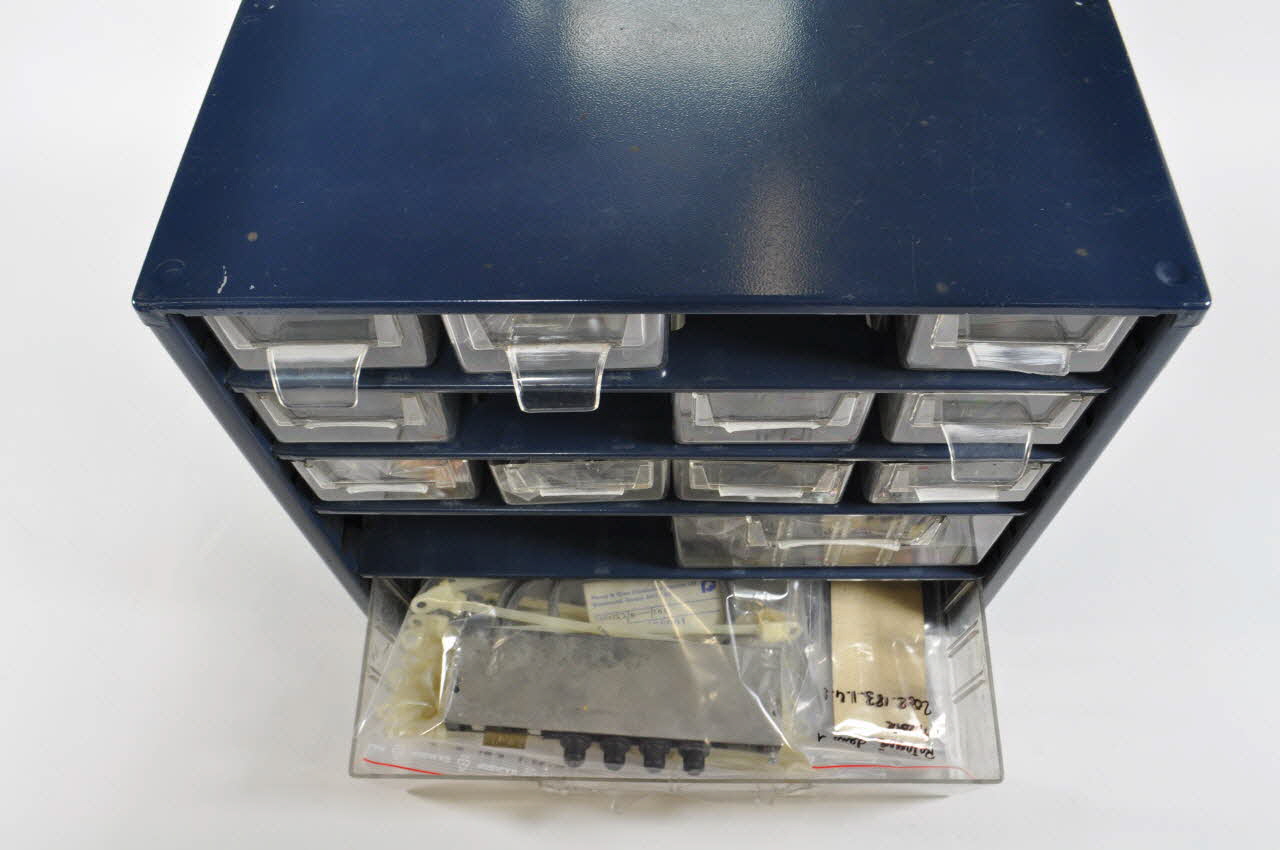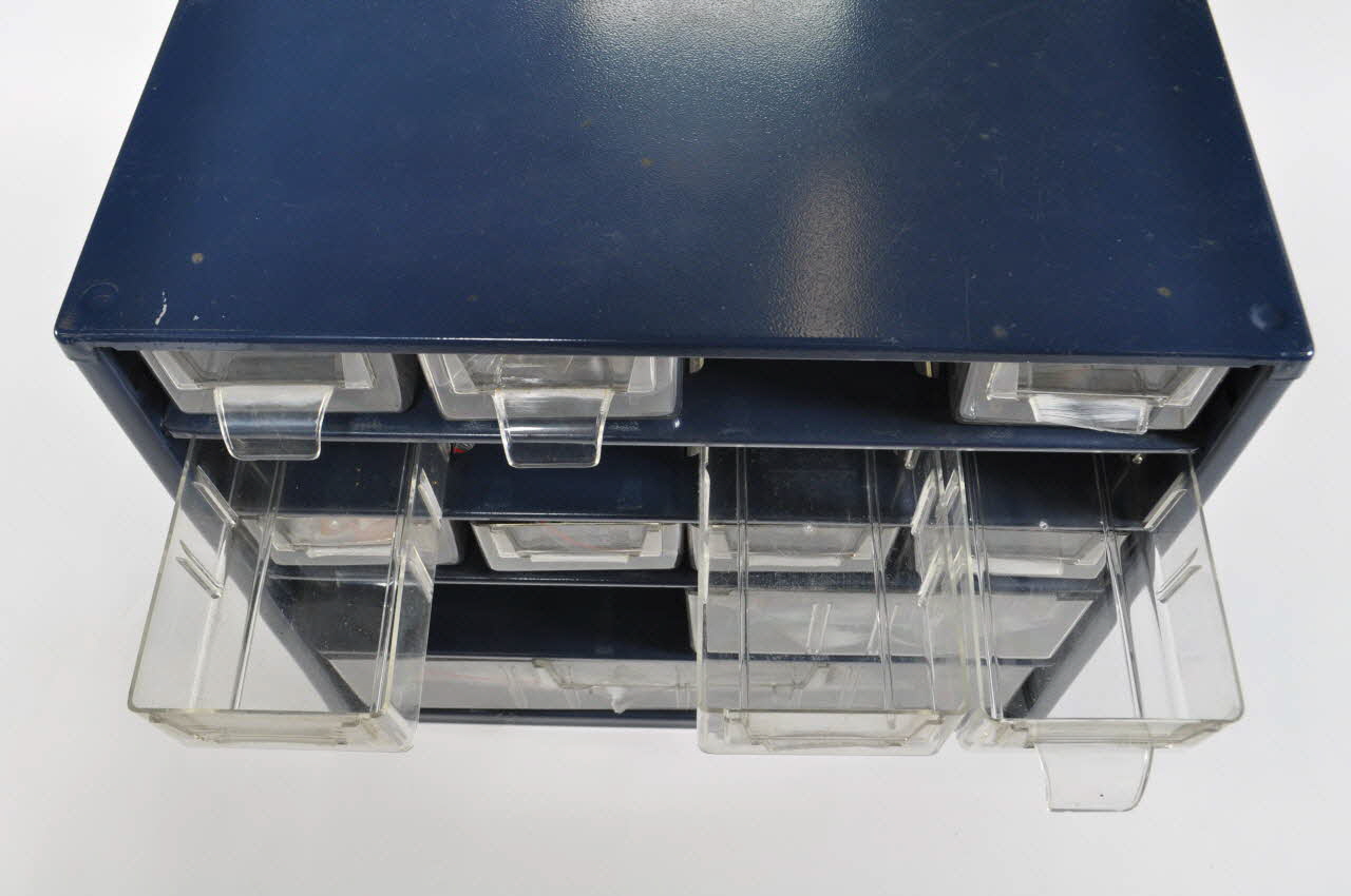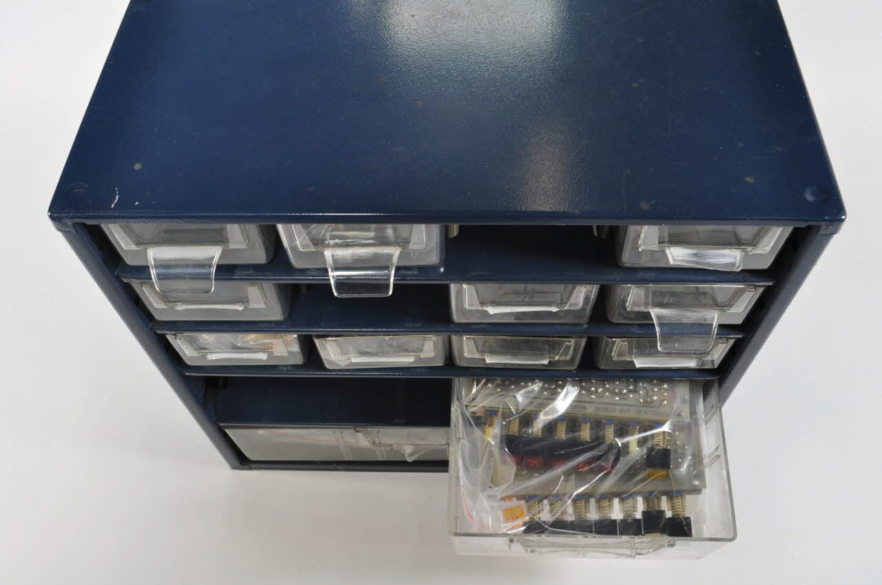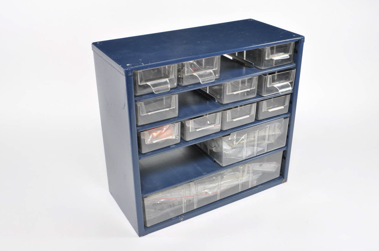 Elément à structure métallique peinte en bleu, présentant quatre niveaux où sont imbriqués douze tiroirs de tailles différentes. Les tiroirs contiennent différents éléments éléctroniques et mécaniques.