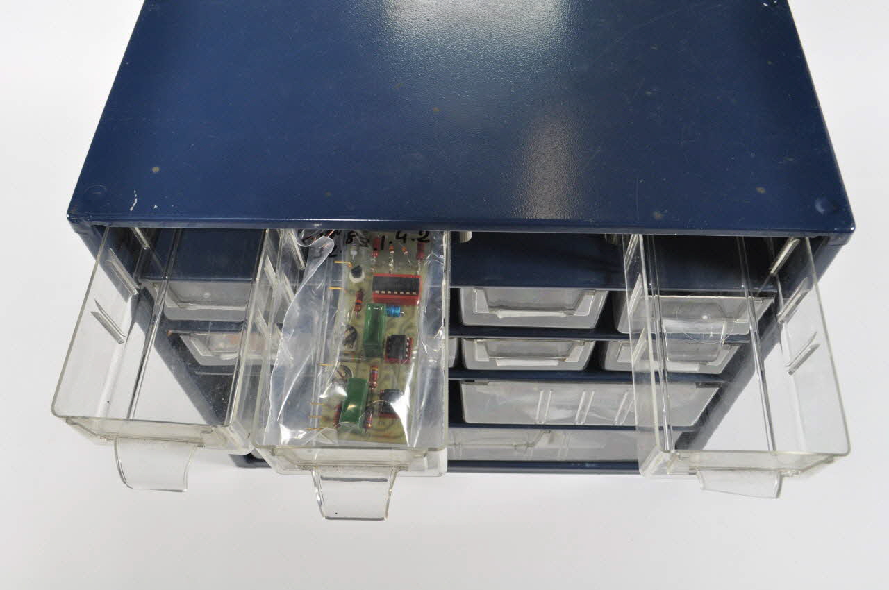 Retrouvé à gauche dans le compartiment central du bas, dans la caisse 2002.183.1.4.1. Tiroir de petite taille, partie supérieure, centre gauche : une carte de circuit imprimé avec composants électroniques soudés. Tiroir de petite taille, partie inférieure, gauche : cubes en plastique noir avec façades de différentes couleurs sur lesquelles sont écrits un chiffre et une lettre en orange. une large résistance bleue, une série de petite façade carrée en plastique orange marqué de la lettre Q. Tiroir de petite taille, partie inférieure, centre gauche : un bonton bleu switch, quatre éléments noirs en plastique relié entre eux, et un large élément cylindrique noir. Tiroir de taille moyenne droit :deux cartes de circuit imprimé avec composants électroniques et boutons. Grand tiroir : carton rectangulaire blanc, une série de plaquette transparente, une large résistance bleue, deux éléments rectangulaire avec fils electiques et série de baguettes blanches.Décor