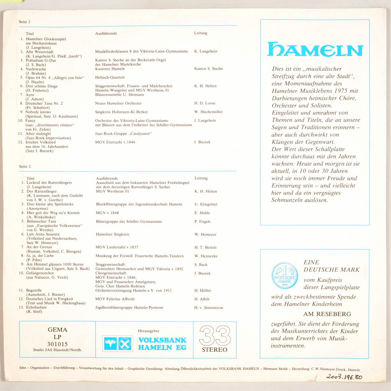 disque 33 tours, Nobody knows, Ja, ja, die Liebe, Allegro con brio, Echofanfare, Musikalischer Streifzug durch eine alte Stadt, Drei kleine alte Spielstücke, Am Himmel glänzen 1000 Sterne, Hier geit der Weg na'n Kiewitt, After midnight, Der Rattenfänger, Gefangenenchor, Nachtwache, Lütt Anna Susanna, Deutsches lied in Ewigkeit, Halmener Glockenspiel am Hochzeitshaus, Ayre, Fancy, Lockruf des Rattenfängers, Irisches Volkslied, An der Grenze, Drei schöne Dinge, Alte Weserstadt, Bagatelle, Deutscher Tanz numéro 2, Böhmoscher Tanz, Präludium G-Dur