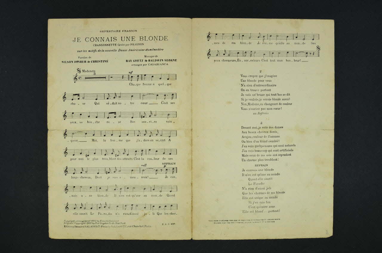 Des inscriptions renseignent le titre, les auteurs, les exécutants et l'éditeur. A l'intérieur, partition et paroles de la chanson. Au dos, liste d'autres partitions publiées par l'éditeur.Matériaux et techniques