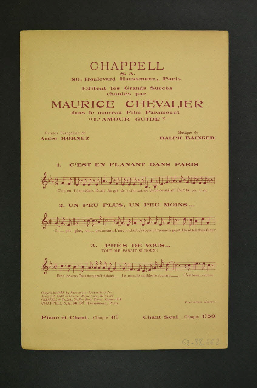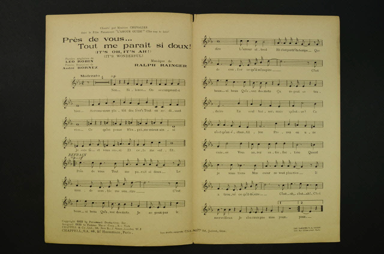 Sur la couverture, le portrait photographique de Maurice Chevalier et Jacqueline Francell enlacés. Les inscriptions renseignent le titre de la chanson, le nom des auteurs, des artistes et de l'éditeur. A l'intérieur, partition et paroles de la chanson. Au dos, liste d'autres partitions publiées par l'éditeur.Matériaux et techniques
