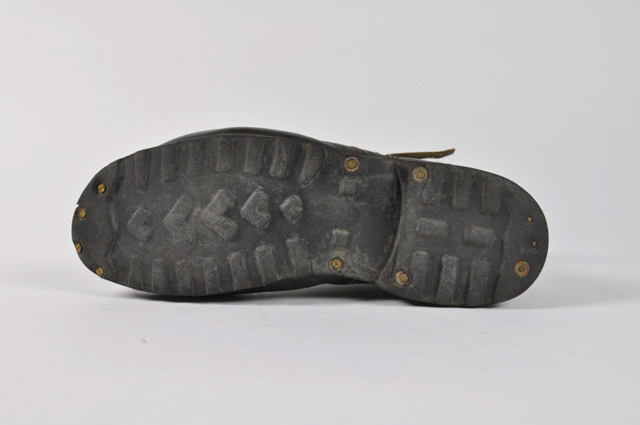 Chaussures en cuir noir avec semelles en caoutchouc fixée par des vis.