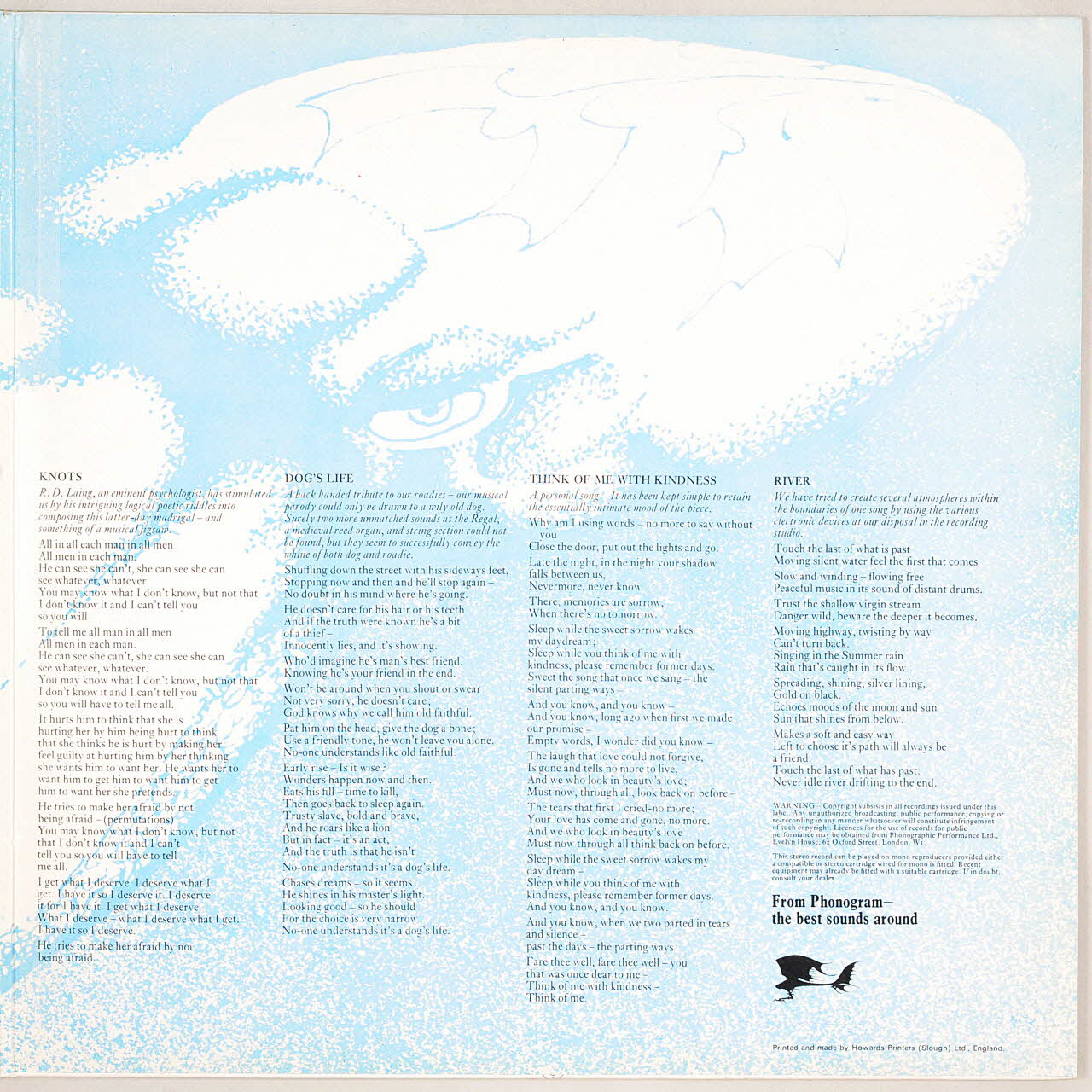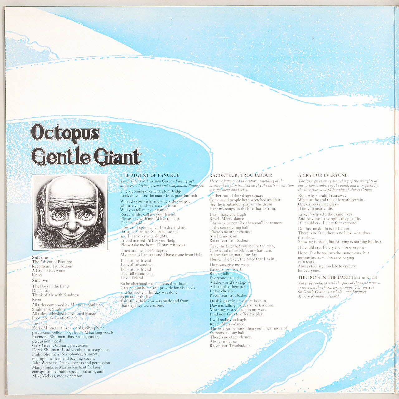 disque 33 tours, Knots, The advent of Panurge, The boys in the band, Think of me with kindness, Gentle Giant, Dog's life, Raconteur troubadour, River, A cry for everyone