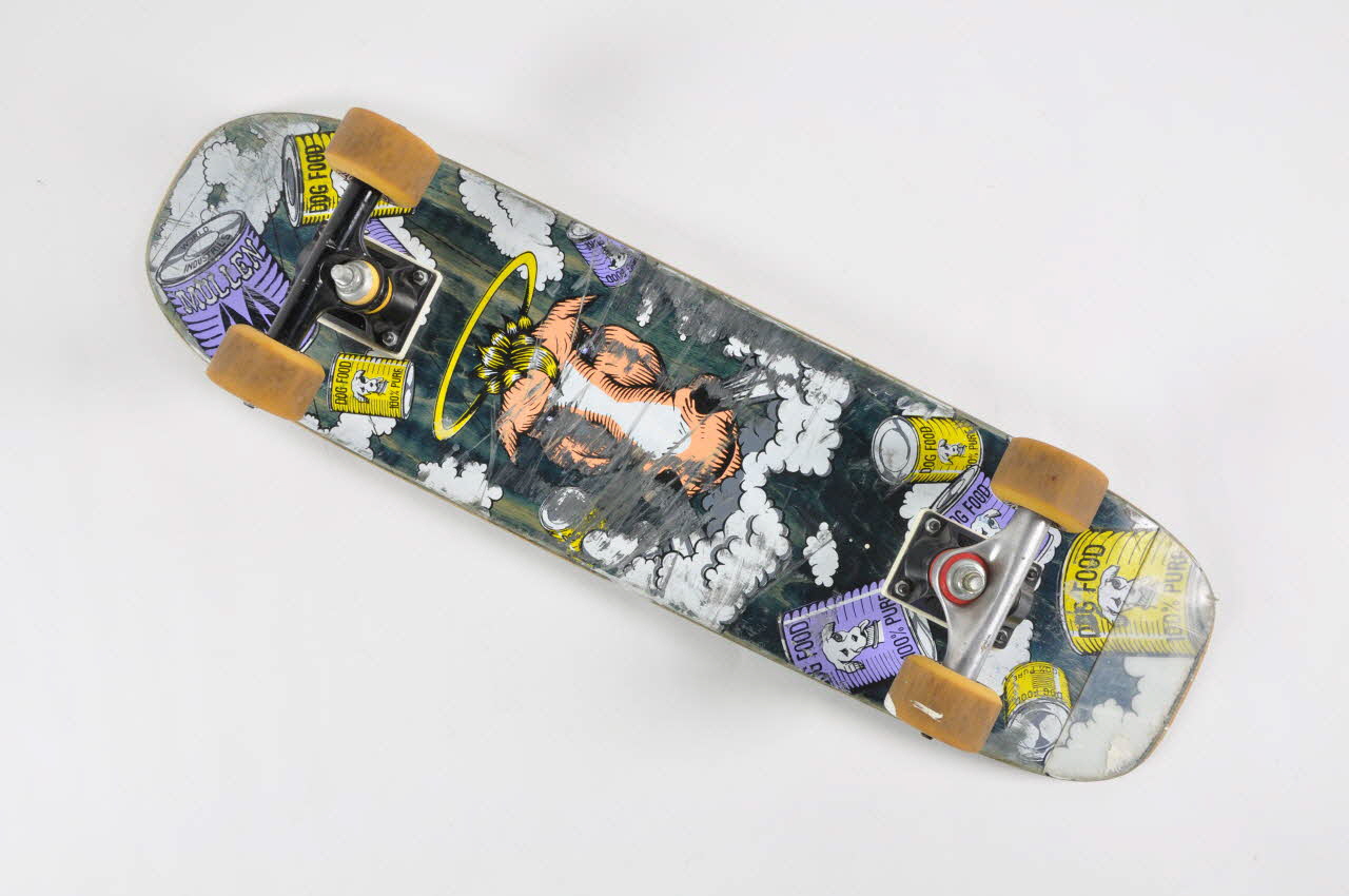 Sous la planche, le décor sur fond vert montre une tête d'animal fulminant avec une auréole jaune et des boites de conserve de nourriture pour chien violettes et bleues.
