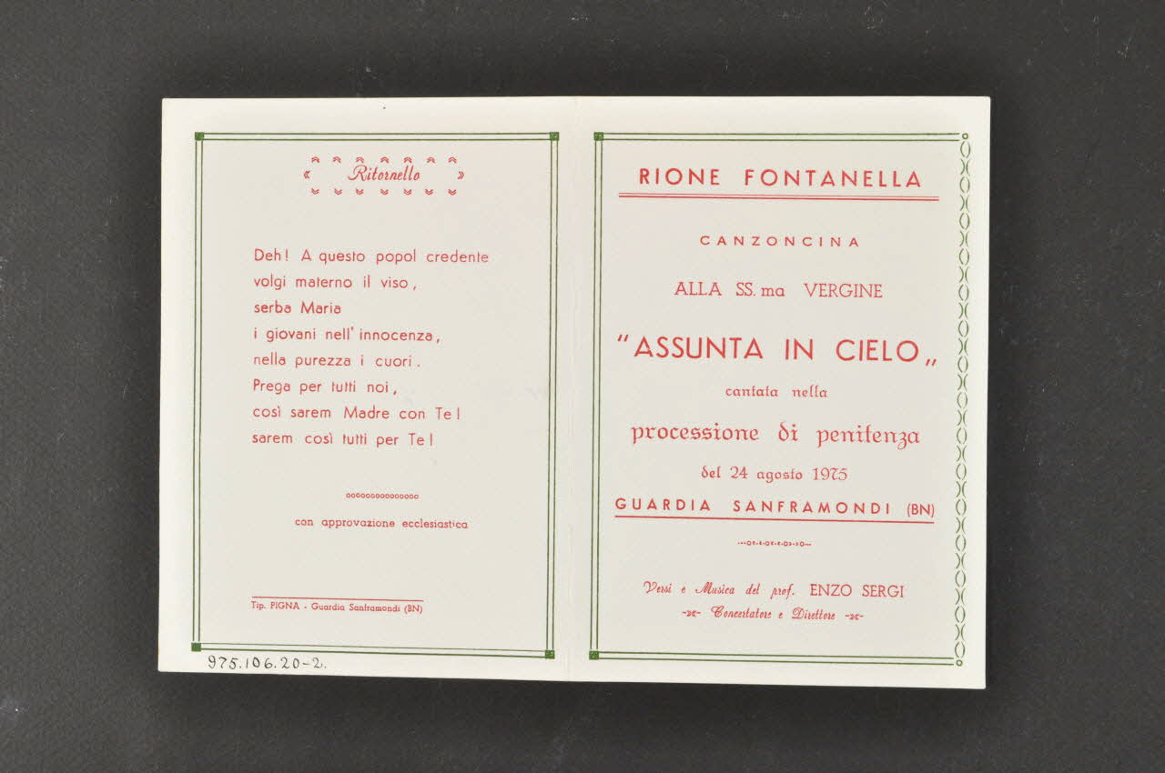 RIONE FONTANELLA // CANZONCINA // AA SS.ma VERGINE // "ASSUNTA IN CIELO" // cantata nella // processione di penitenza // del 24 agosto 1975 // GUARDIA SANFRAMONDI (BN) // // Versi e Musica del prof. ENZO SERGI // Concertatore e Direttore, rectoParoles, cantique