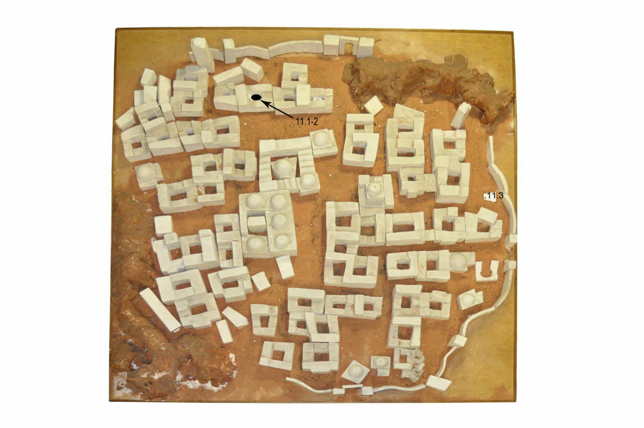 Trois éléments fragmentaires de la maquette 2003.8.115.4.1 en plâtre et de différentes formes.Matériaux et techniques