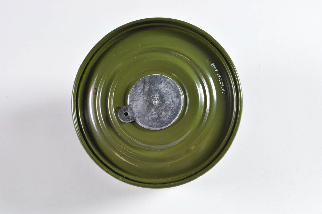 Petite bouteille cylindrique en métal peint en vert. Elle a un bouchon vert. Elle est munie d'un bouchon de la même couleur. Un rond de plastique blanc recouvre l'orifice.