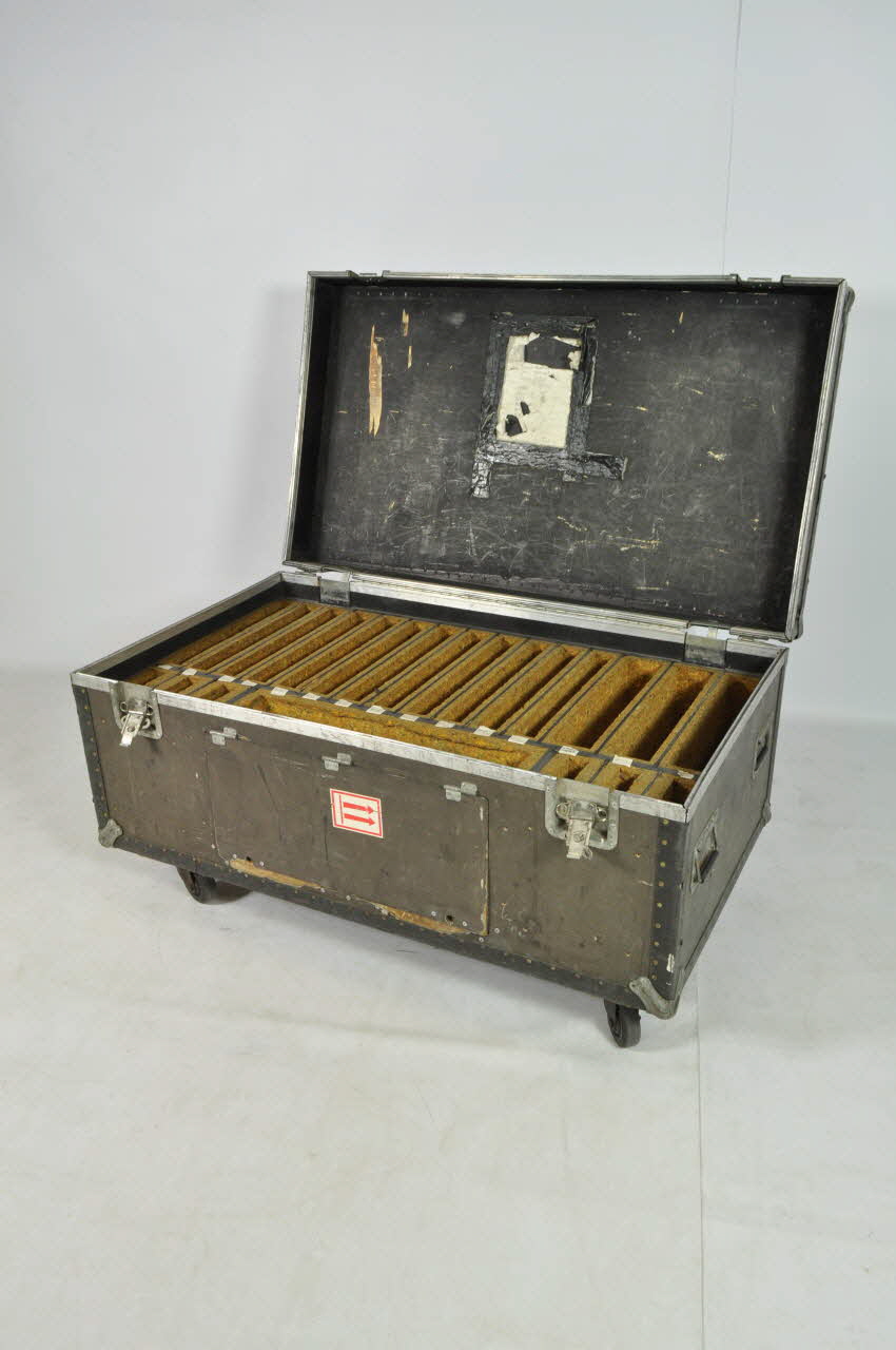La caisse à couvercle, possède quatre roulette aux angles et une trappe sur une face sur le côté. Les angles sont renforcés de plaques de métal et les arrêtes de languettes en plastique.Décor