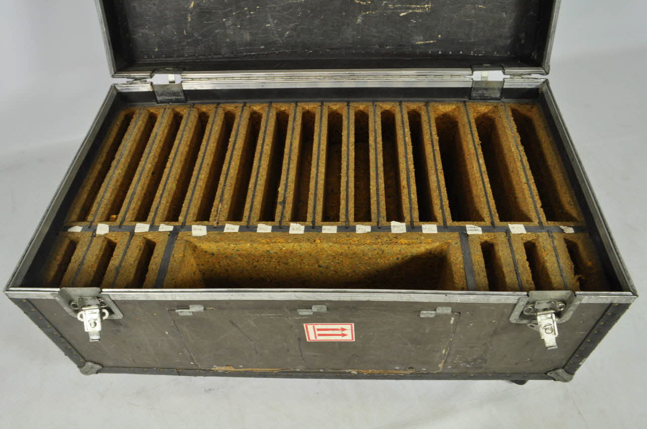 flight case / Fligh case à roulette avec un plateau et des compartiments contenant des accessoires.