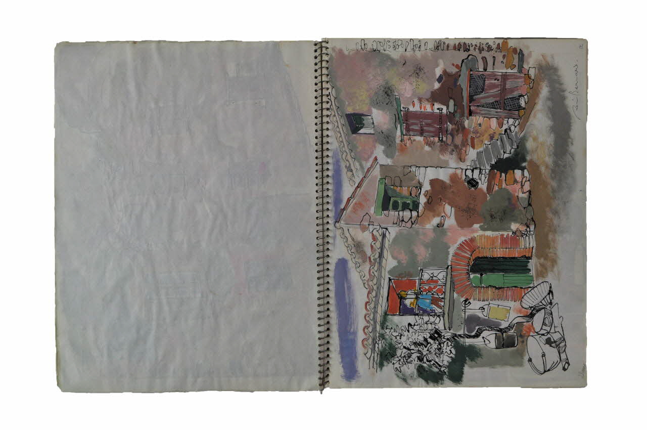 Les deux feuilles cartonnées constituant la couverture sont de couleur marron. Une marque est présente dans le bas de la quatrième page de couverture. Les pages sont numérotées de 1 à 80 ; les pages 64, 66 et 79 sont manquantes. Toutes les pages sont remplies. Les dessins sont faits au pastel, à la gouache et à l'encre noire. Ce carnet ne contient quasiment que des paysages pris sur le vif, aux couleurs vives et tranchées, parfois réhaussés de cernes à l'encre de Chine. Les dessins sont pour la plupart signés en noir. Sur certains sont notés le nom du lieu reproduit. La couverture de devant présente des inscriptions notées au feutre noir. Il s'agit du nom des lieux visités par l'artiste suivis des différentes années. Le nom de l'artiste est noté dans le bas. Une feuille double de papier buvard rose est glissée à la fin du carnet.Inscriptions