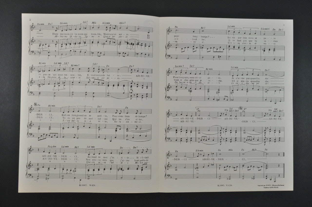 Feuillet rectangulaire en papier industriel, imprimé à l?encre bleue (sauf l?intérieur à l?encre noire). Sur la couverture, les inscriptions renseignent le titre de la chanson, le nom des auteurs, de l'artiste et de l'éditeur.